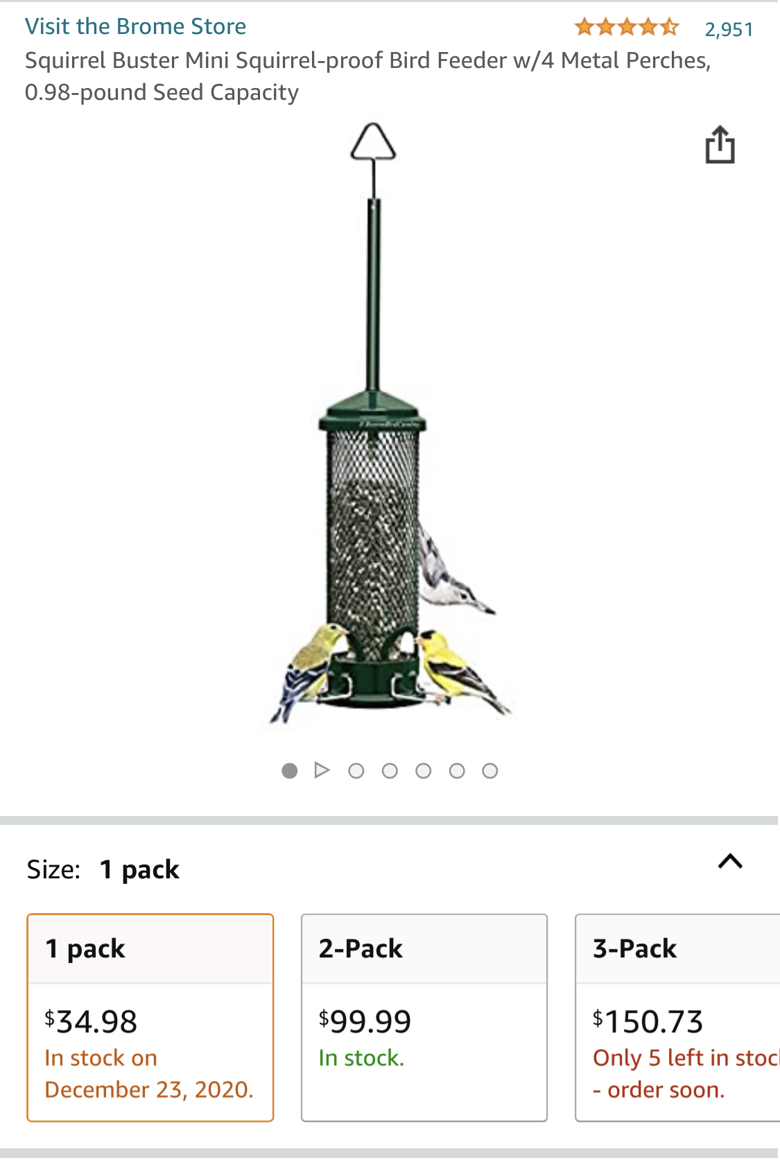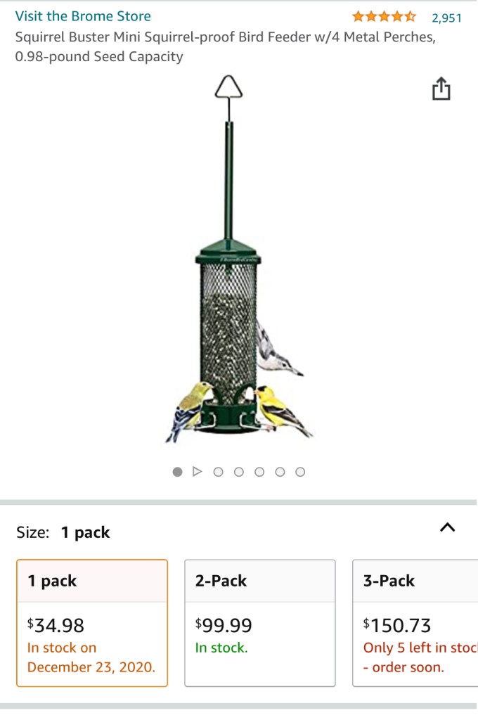 The squirrel buster bird feeders are what we have- and I’m really happy with them. They work by the outer part pulling down and blocking the seed if a squirrel gets on them, but will also do so if 2-3 doves land on them… which I also like. This then forces the doves to eat the seed that has fallen under the feeders… which the cats like. (Sorry doves)