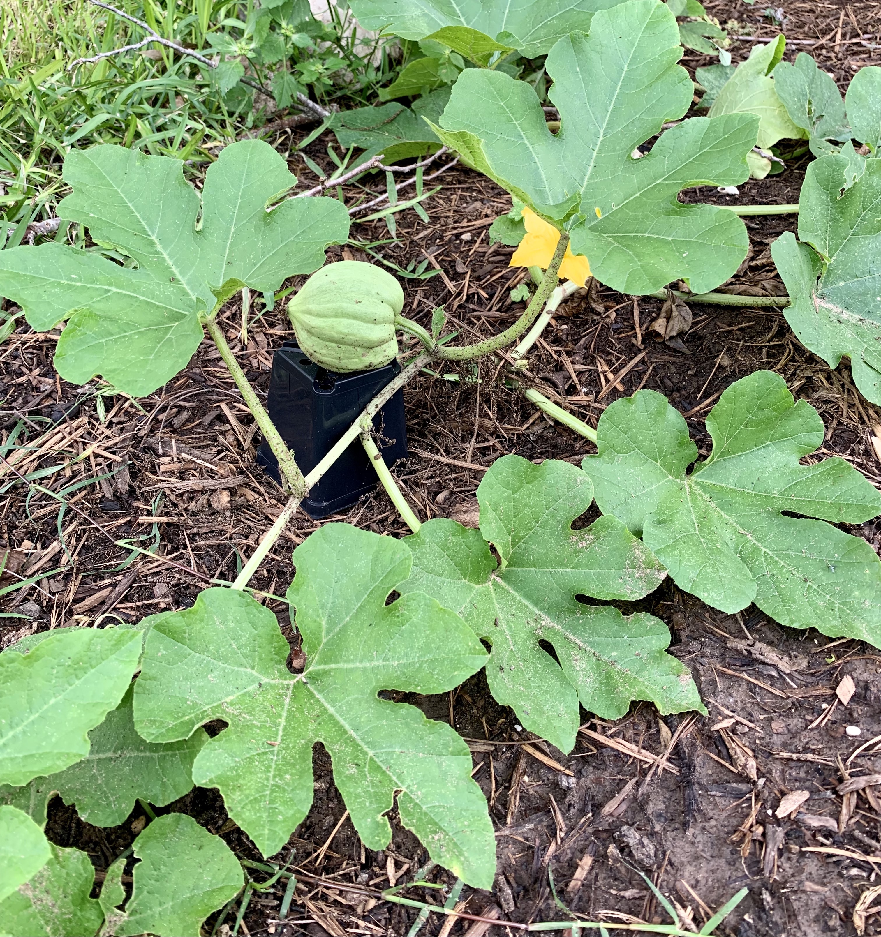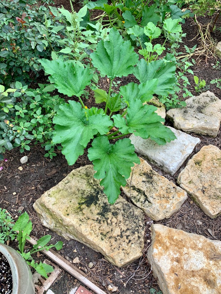 So I gave my youngest the loose seeds in the bottom of the “seed bag” (where I kept all the packets) to plant. So here is another zucchini, terribly placed next to a walkway- it is like succession planting, right?After I planted acorn squash I found out it is supposed to be one of the most susceptible to squash borers, so not the greatest of news. But the lone survivor of the squash borer genocide is trucking along for now. I have to raise the fruit up on a pot so it doesn’t rot as the ground is perpetually soggy. This is what we call “new territory” round these here parts. Also beDAMNED bermuda grass making it’s way everywhere.