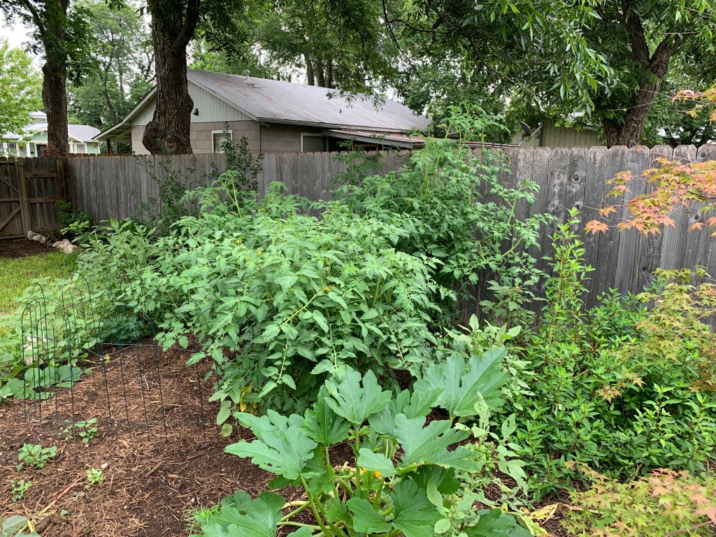 The front of the “not-chicken proof chicken-fencing” WAS planted with 3 zucchini’s and 3 acorn squash(es?)… but squash borers have been wreaking havoc. Which is sad because zucchini plants have AMAZING foliage. The color! The size! The imminent collapse of the last one standing! Sigh… not sure how everyone else prevents those damn things… but I’m not doing a daily inspection of each leaf, so que sura sara.