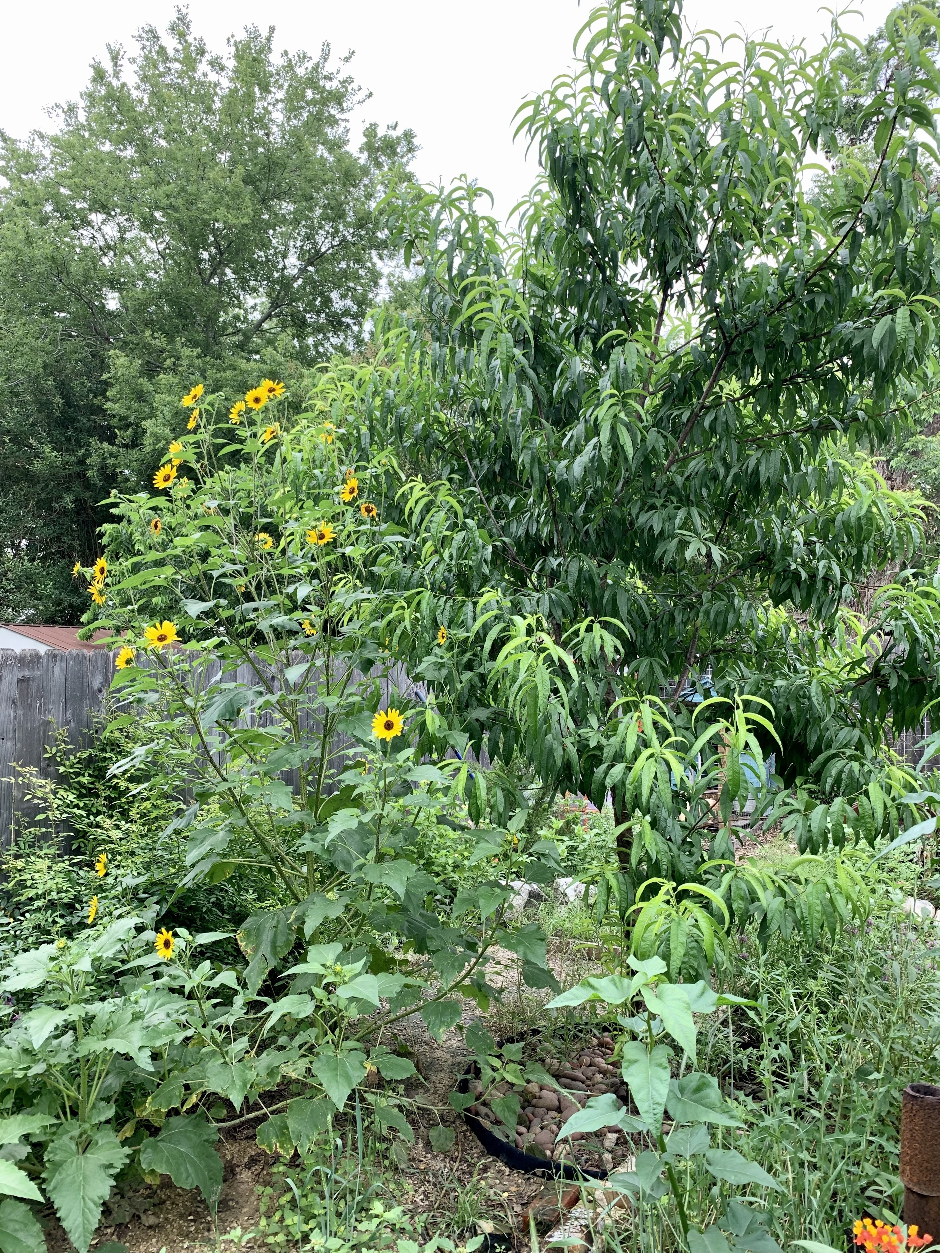 Why yes that is a sunflower that’s almost as big as the peach tree. The eye rests on no open spaces currently… every inch is filled with something, most likely sunflowers, amaranth, self seeded wheat, and tropical milkweed seedlings. Oh and self seeded zinnias. I’m kinda bitching but not really bitching.