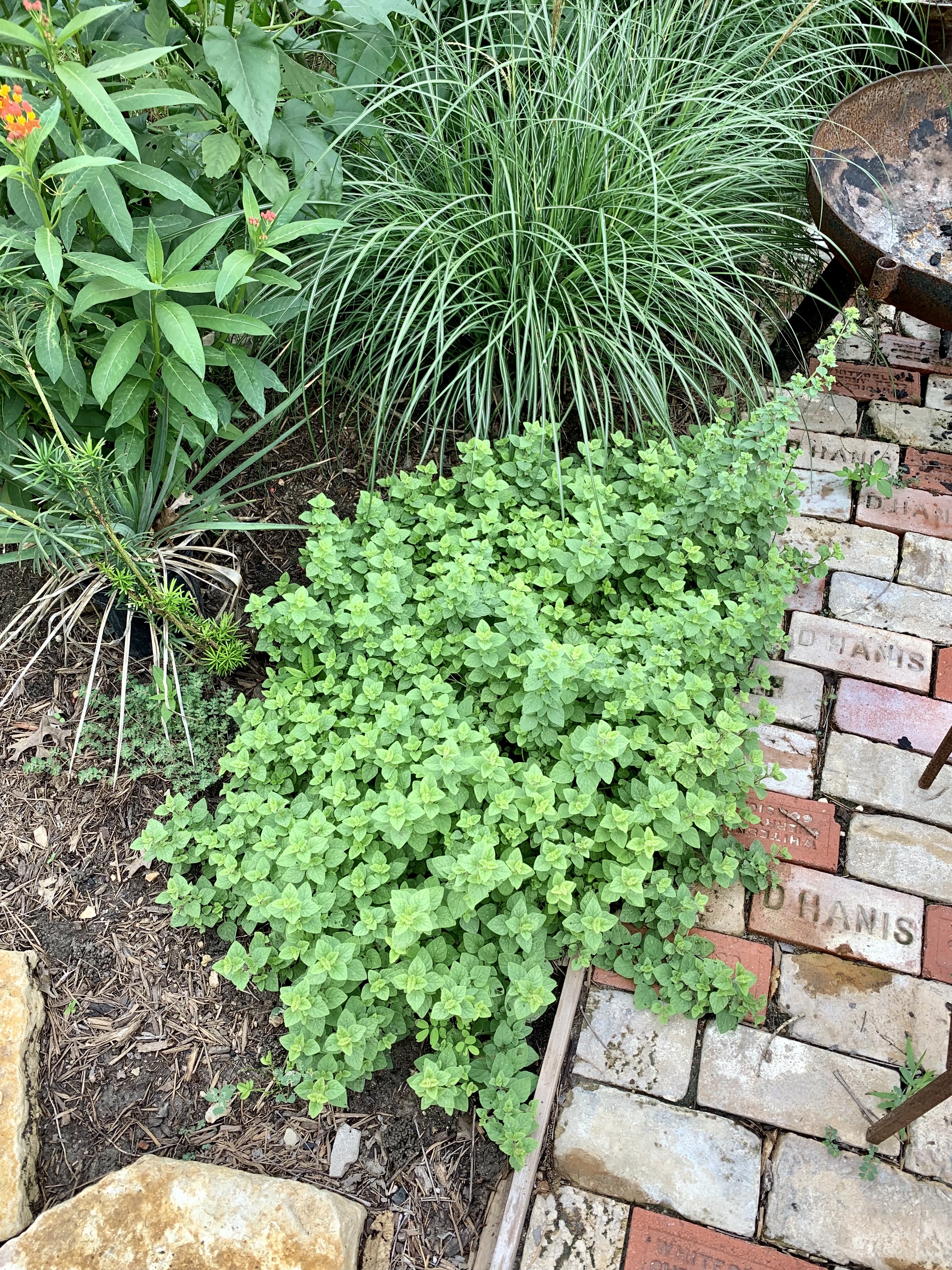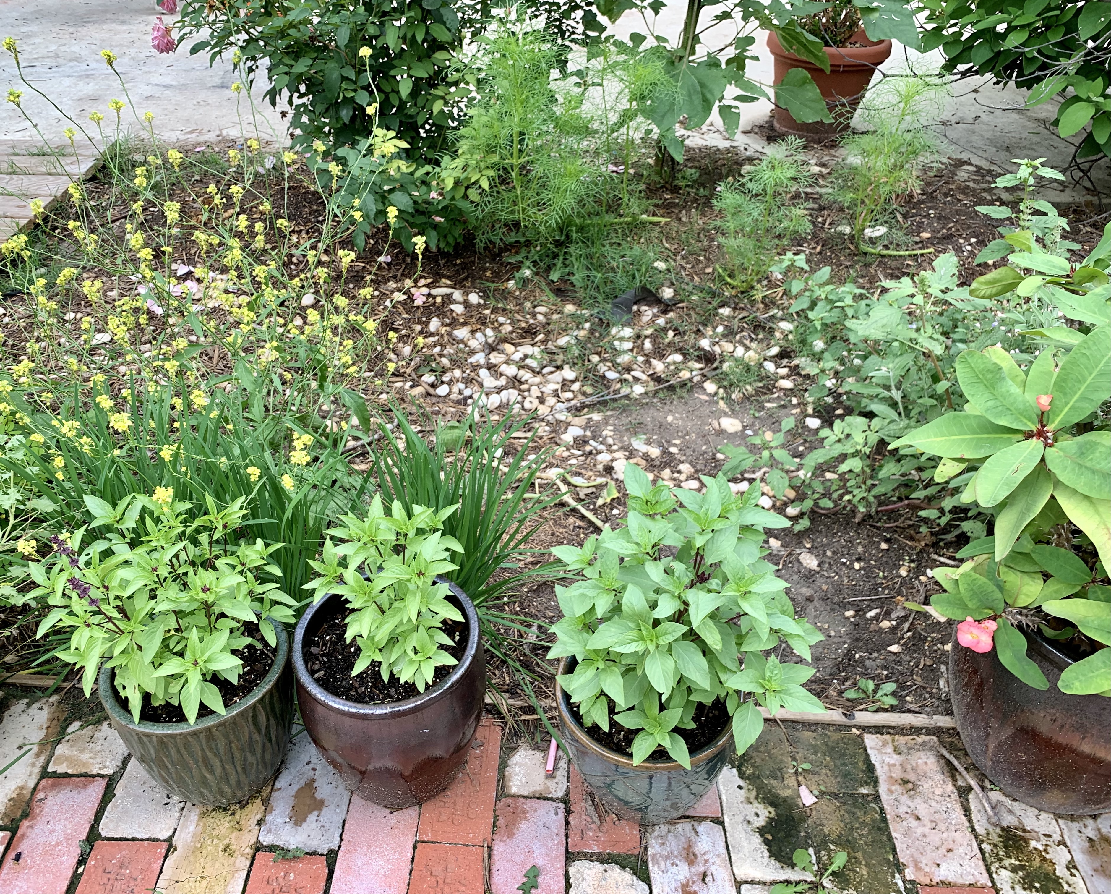 Three pots of Castroville basil seedlings. There are 4 that are in the ground in various spots of the yard as well. The yellow flowered plant in the background is a self seeded kale, there is another on the opposite corner of the patio as well. This picture properly conveys the muddy, weedy current state of the dry creek.This oregano has languished for YEARS and is finally coming into it’s own and filling in. Hope it doesn’t need to get this amount of watering forever though!