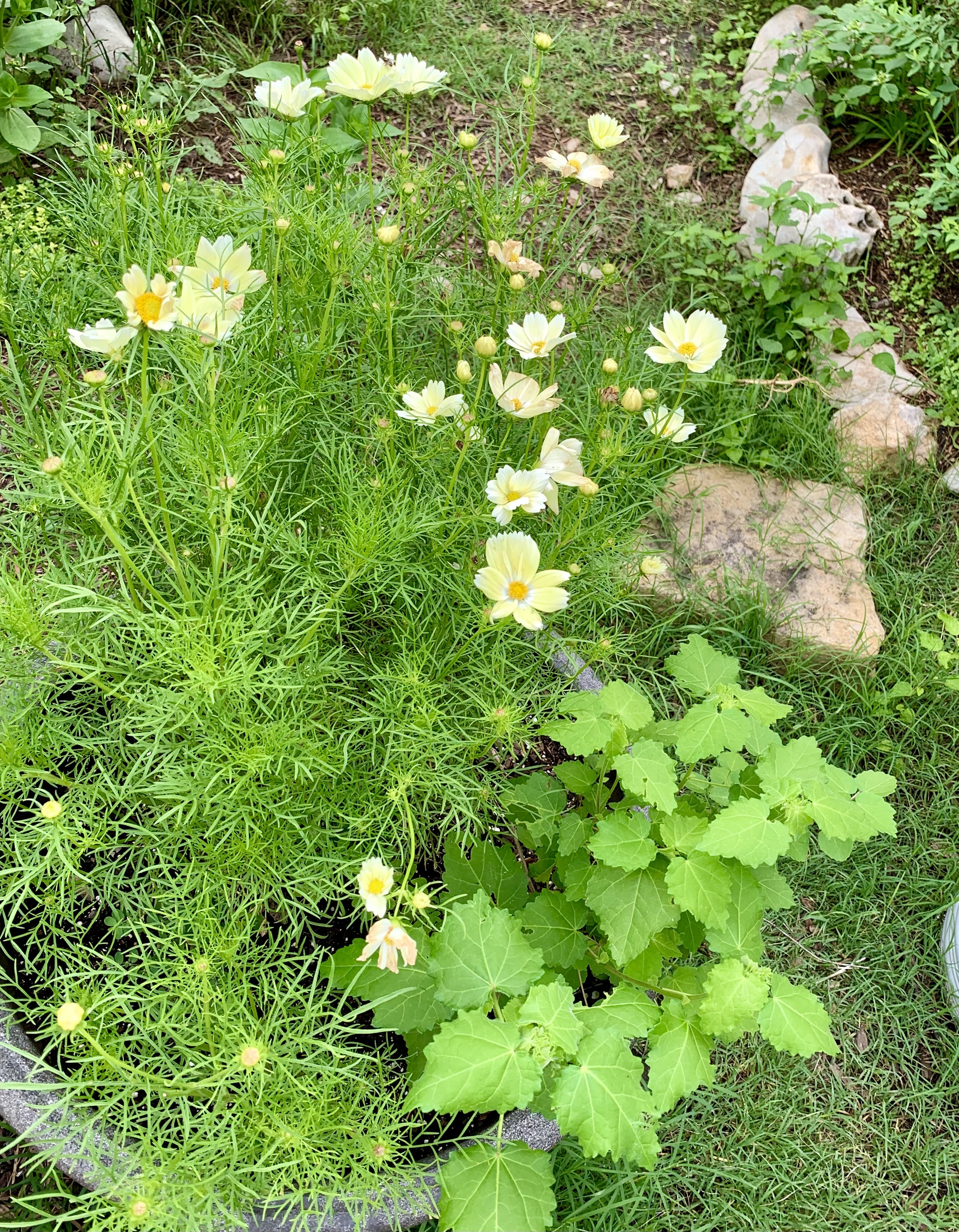 I had a devil of a time finding white cosmos seeds back in March. And I was so excited when I finally found some! Well turns out that was a bait and switch- because these are lemon yellow and not white, and also dwarf instead of normal sized. Sure they’re pretty, but I had a plan for y’all and you dwarf lemon bastards F-ed it all up! Gah!