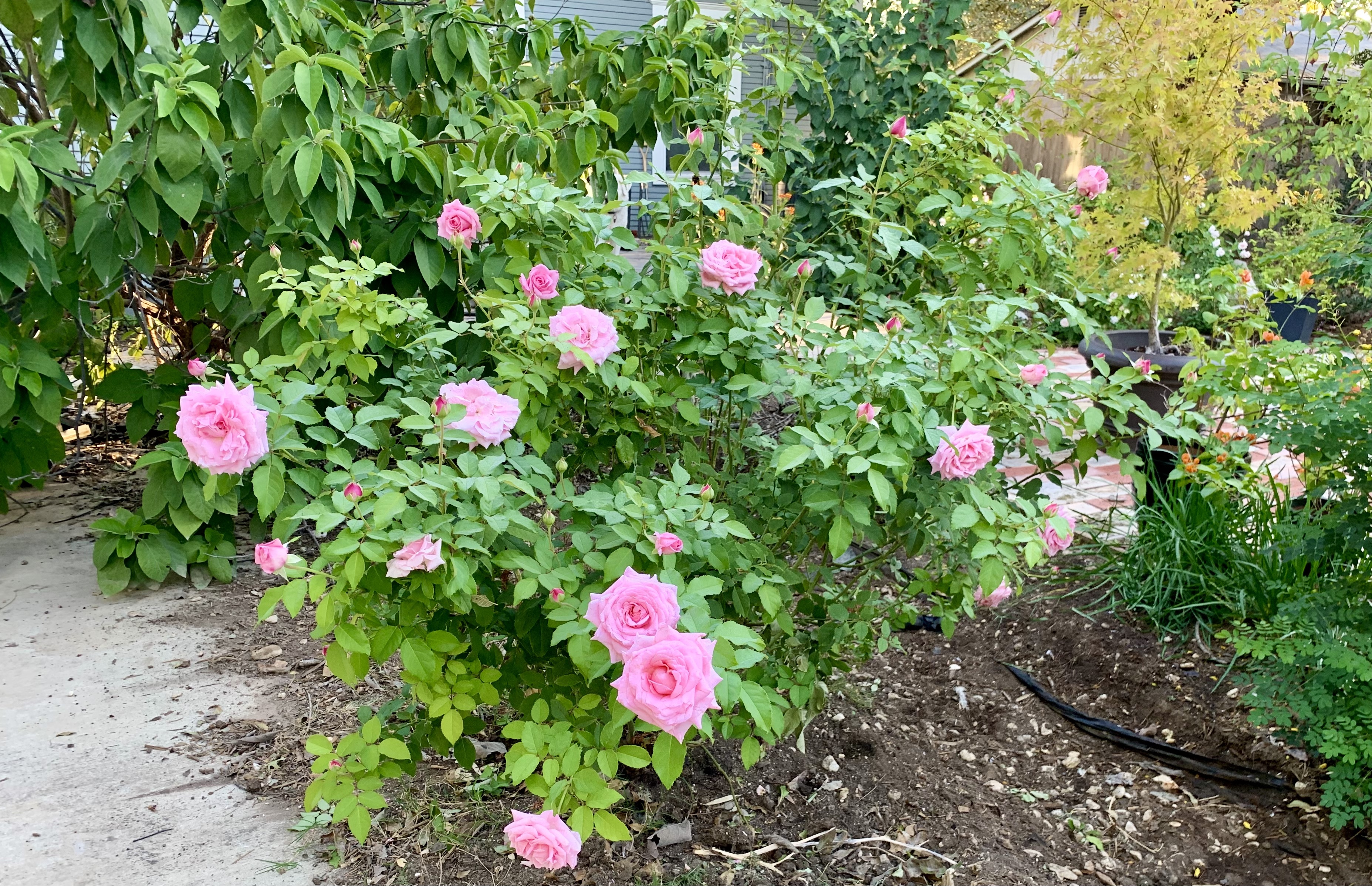 We’ve had quite a wet summer and fall and boy howdy is that paying off with some really spectacular roses late in the year. Also, don’t mind the mess under that rose- we’re pulling out the dry creek in this section and so it will be replanted and mulched soon. We are enjoying the season of more pink, blush, purple, and red roses than we know what to do with. It is (she says humbly) a bit of a goddamn dream back there right now.
