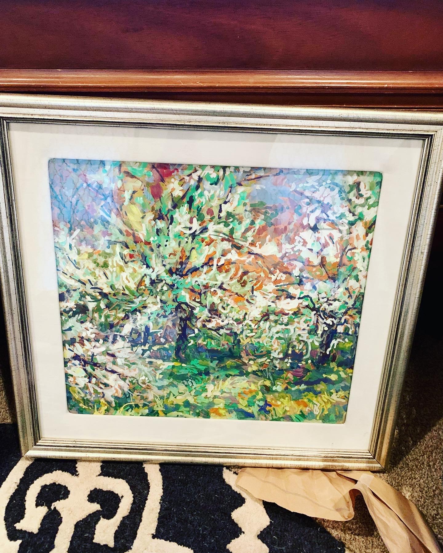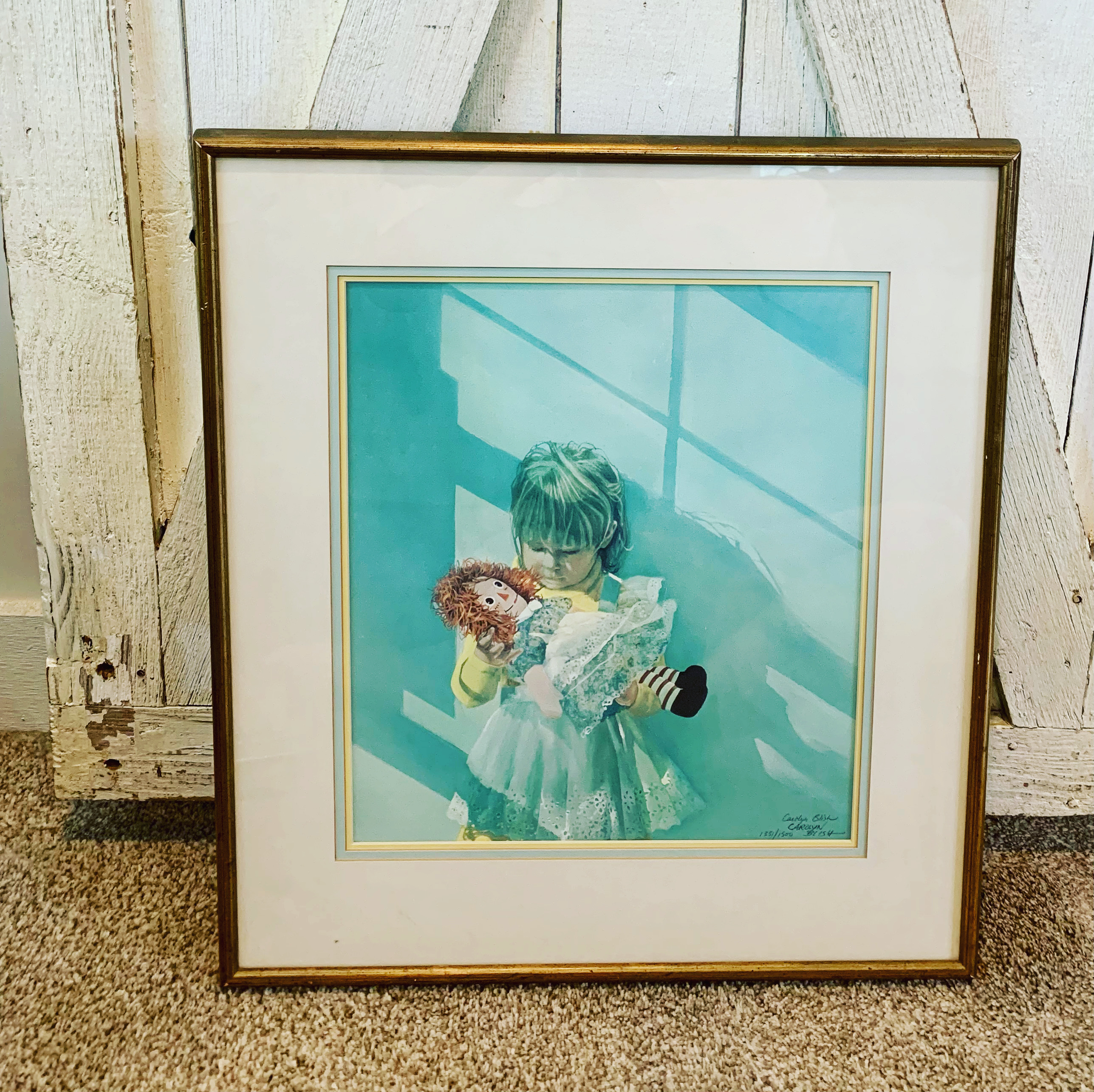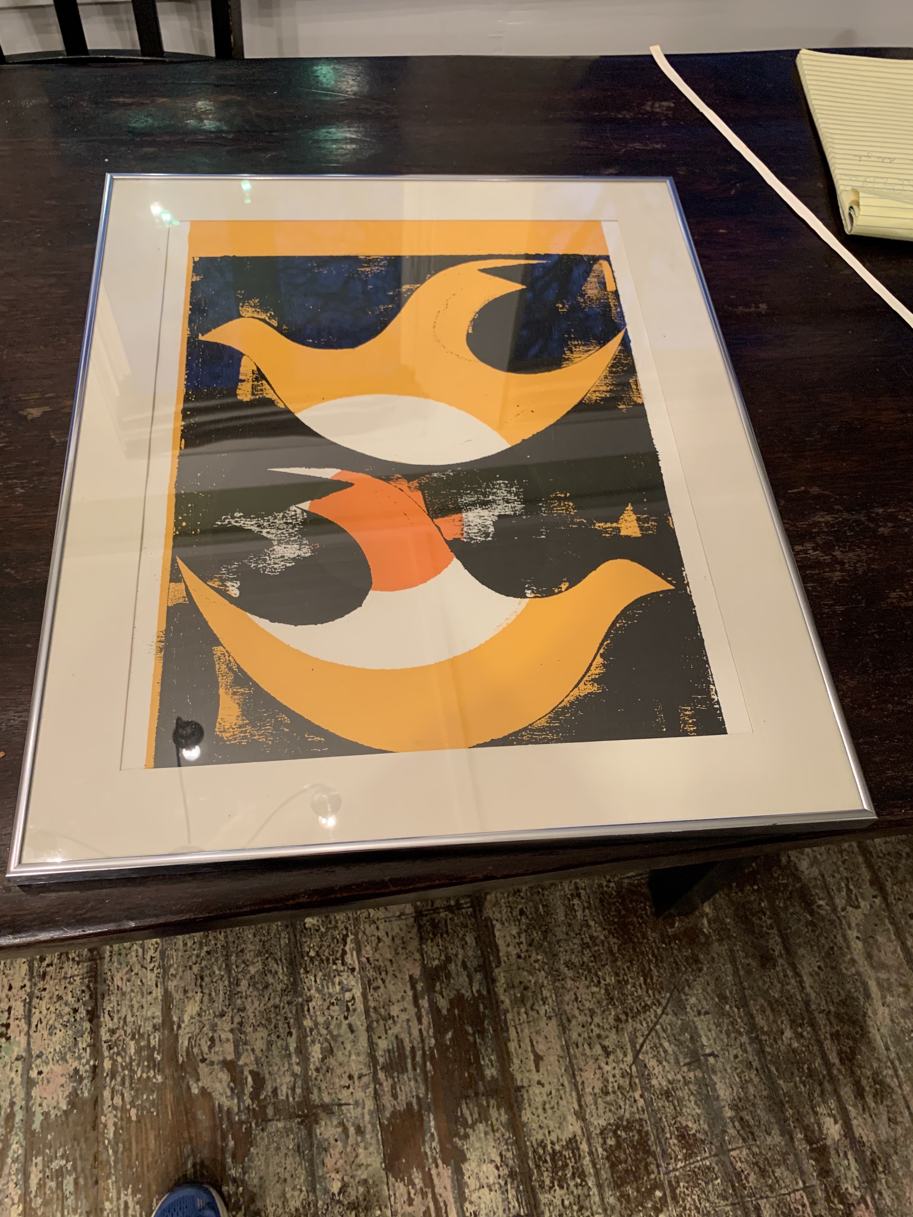 Okay so this next one is a is a signed and numbered Mary Ann Ginter lithograph that the print alone is going for $99 online. Turns out it’s a part of a pair of paintings- and if sold together the prints go for $1,200. (This one is called Mulberry Moon). I SERIOUSLY would like a word with the framer who looked at the mauvest painting ever and decided on a double mauve mat that was then framed in mauve metal and thought it was a good idea. (I’ve now said it too many times and the word mauve holds no meaning anymore) I KNOW if this is rematted in white it would look much more modern- it’s actually quite a nice work, though not in a color scheme that calls to me. (The moon is pretty on the nose for an 80s style though) But it already had broken glass! Should I even have gotten this one at all? Sure it sells for more than I paid for it, but how long will it take to actually sell? Time will tell.