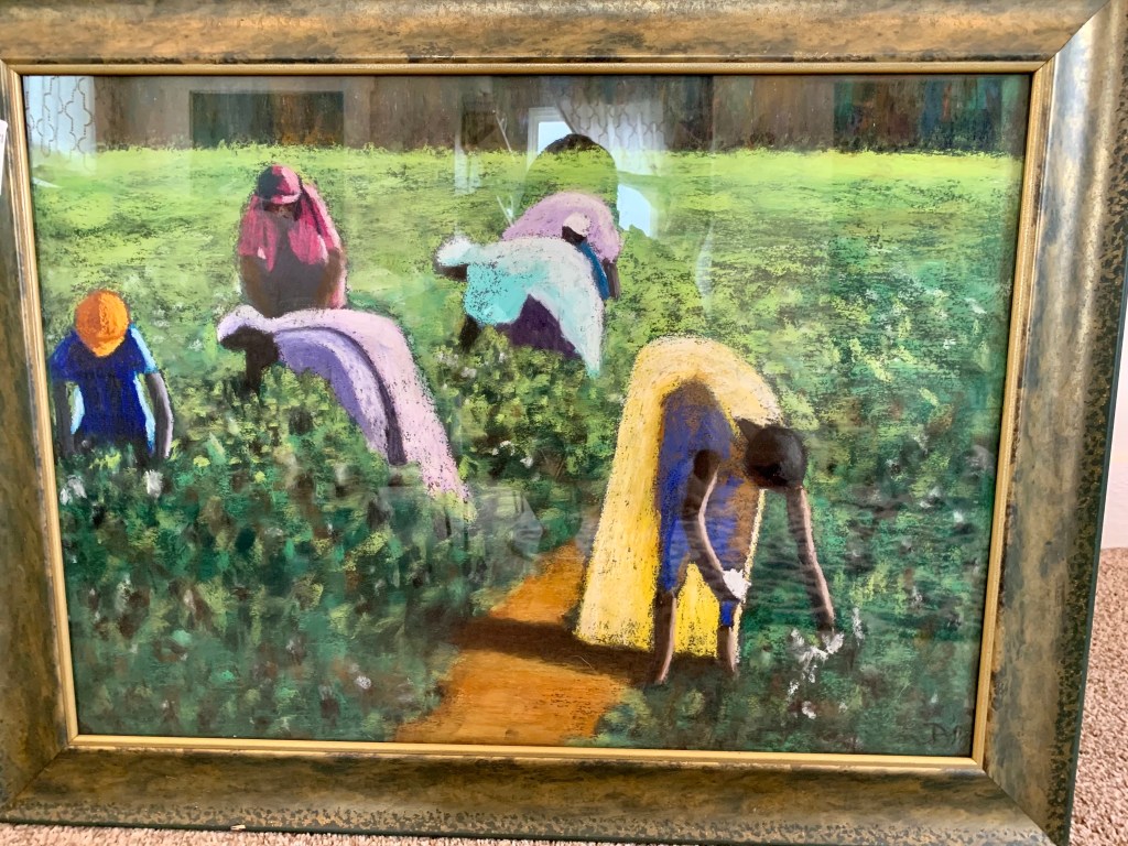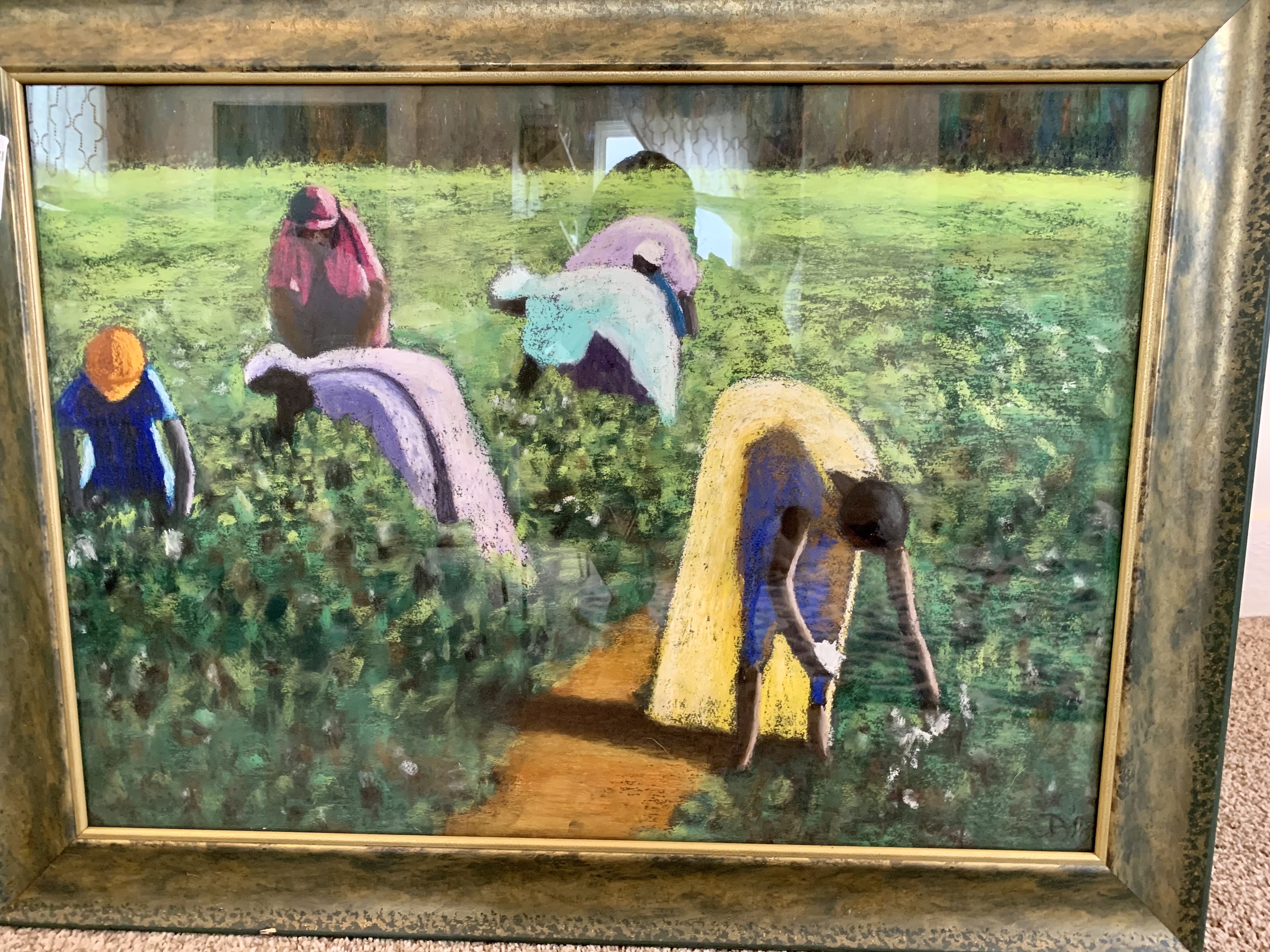 So this next one I took a chance on because it was a little difficult to determine if it was original or not- and lucky me- once I opened it up back at home I was able to determine it is in fact an original pastel! It’s also 31″ wide- so that is massive for a pastel work too! Signature is SUPER hard to track down though as it’s just initials- AJ? AR? JB? It’s from 1999… I’m still trying to research. And it is lovely and beautifully done but I’m not sure I like the idea of ever getting comfortable with a picture of people picking cotton in my own house, you know? Just me? I’ll totally resell it but I have to learn more.