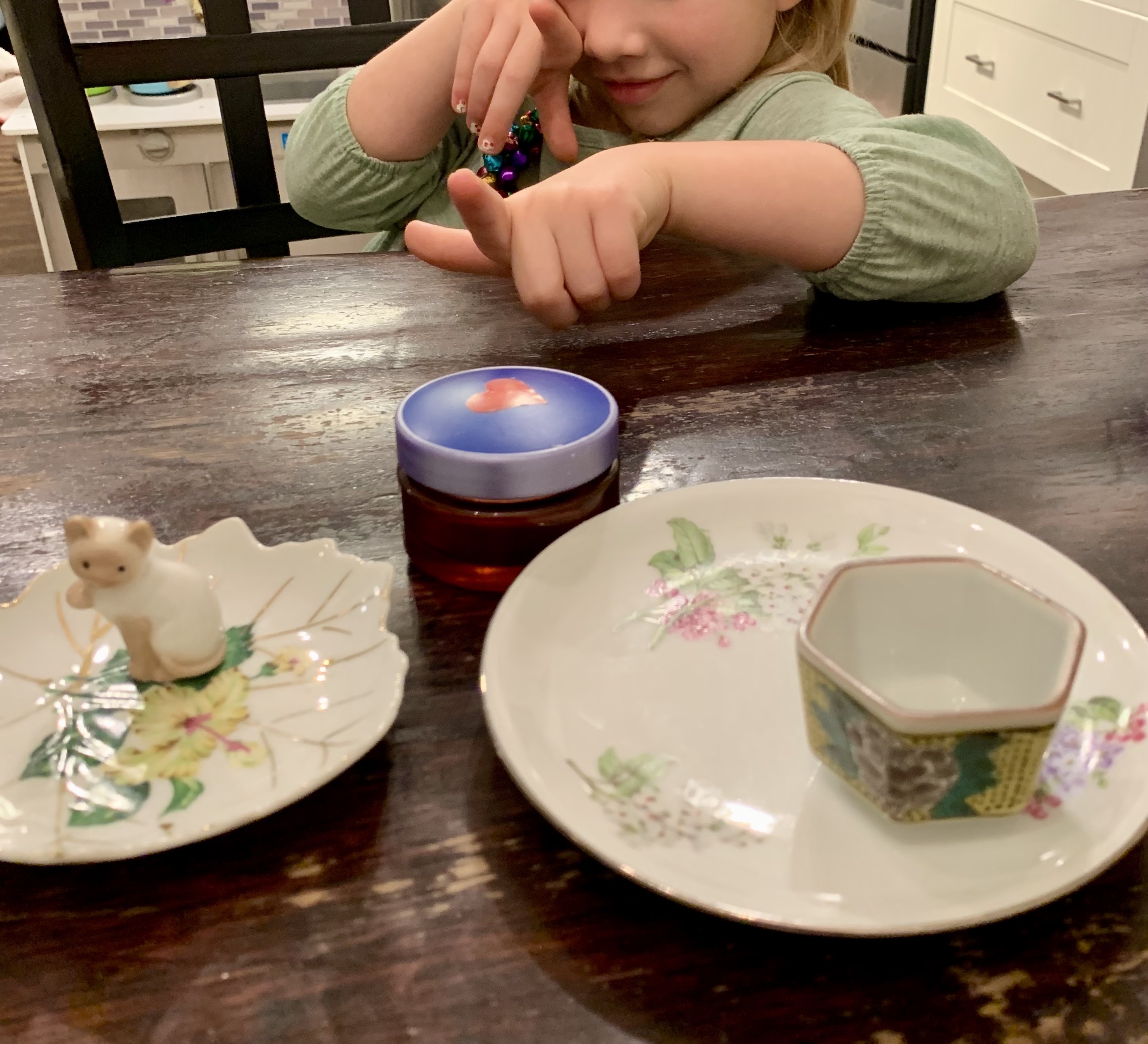 You can’t quite see it but she’s also wearing a necklace I got at the first estate sale for $1 that is entirely made of jingle bells- worked like a charm to always know where she was at the other estate sales. How was taking kids to estate sales? Fun and never again, that’s how. MAYBE one at a time, but like seriously- so many questions and breakable things to worry about.