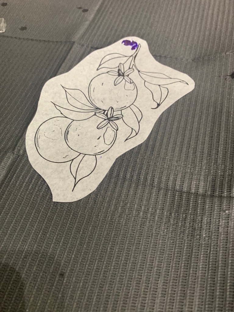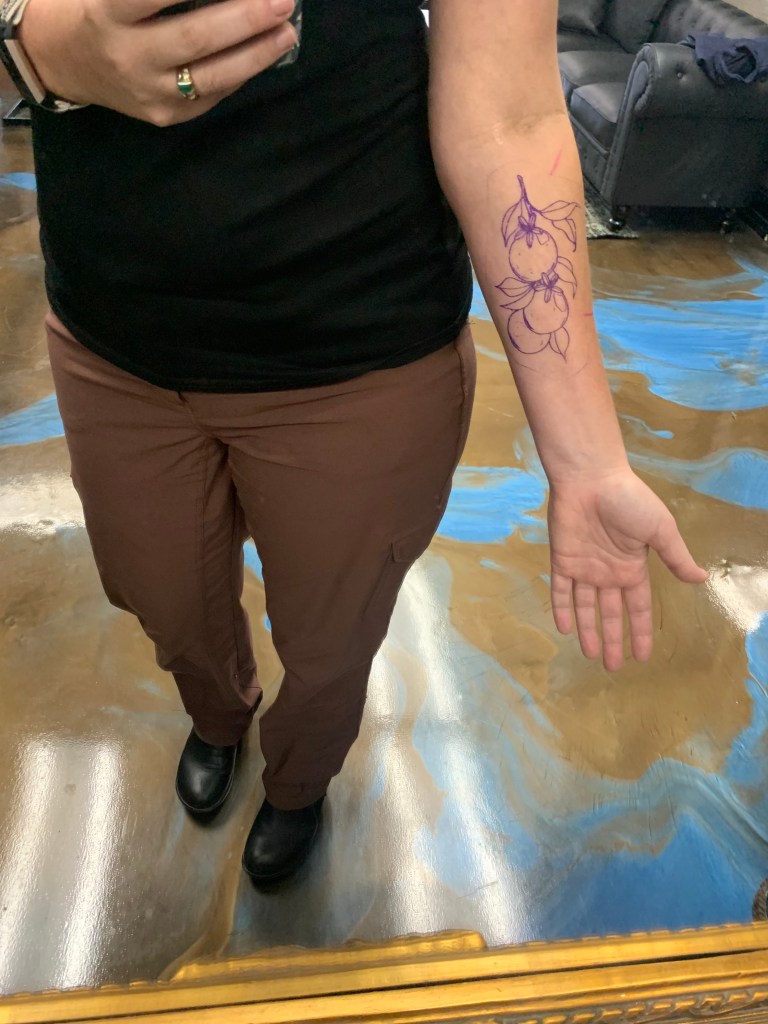 So when I booked for the tattoo the guidelines are to not overwhelm them with ideas ahead of time, just a general idea and size desired. But when I got there the tattoo artist had mocked up the design with only 2 fruits (annoying as I’d requested 3) and with mulberry tree leaves. And look, I’m all for artistic license and all, but it’s also my arm so I had to advocate for the design I wanted pretty hard- and there was no way I was having citrus fruit with mulberry leaves. And then I had her resize about 5 times. She… did not seem to enjoy any of this but I kept having to remember it’s what I want that matters and this is my ONLY time to tweak the design.