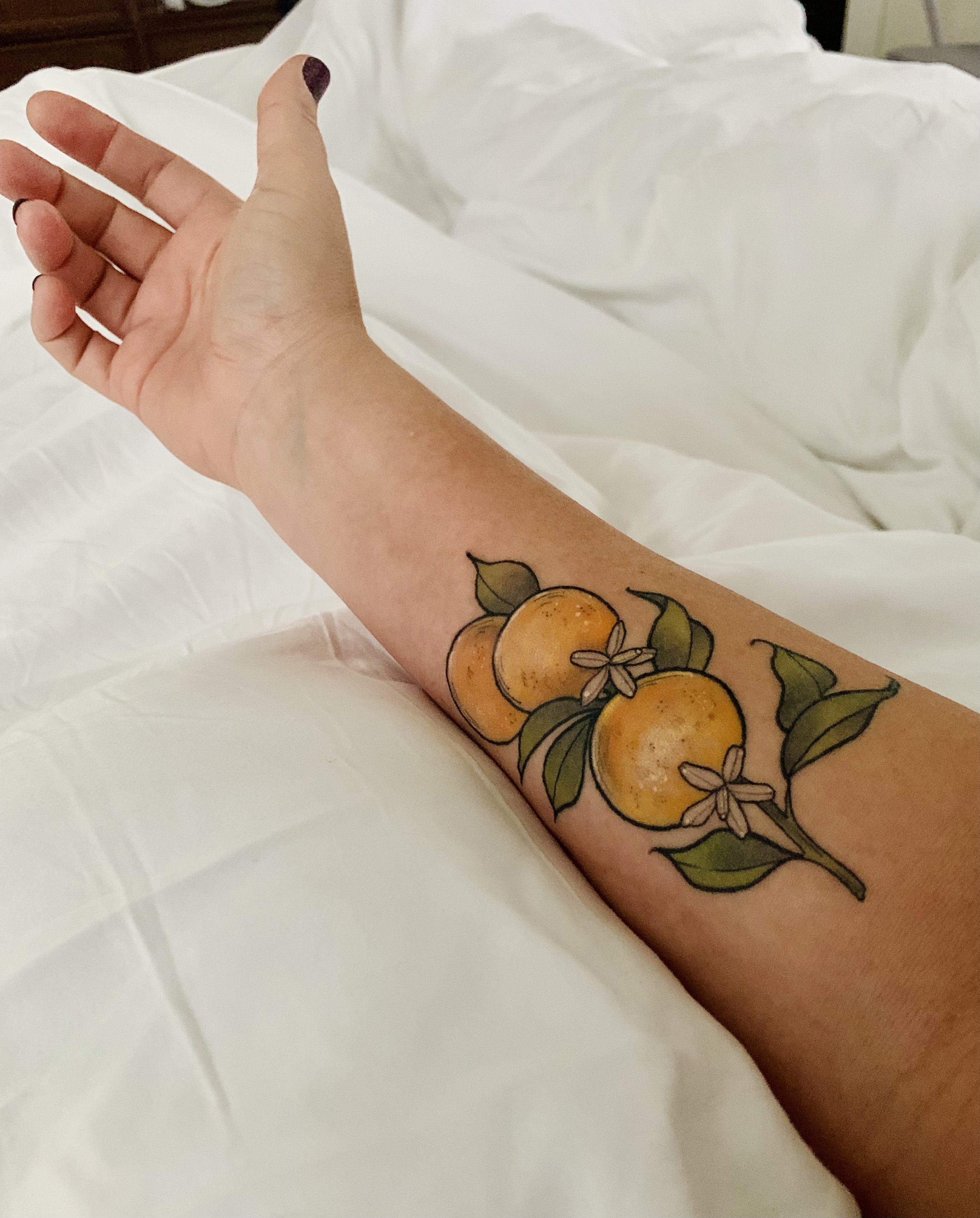 So I had a dream, months and months ago, that I had a right forearm tattoo and when I woke up I just went: yup, that’s happening and is now a thing. There wasn’t any weird wavering about it either. I decided on a calamondin (here and here) branch fairly quickly as it’s my favorite plant, and a few other reasons.