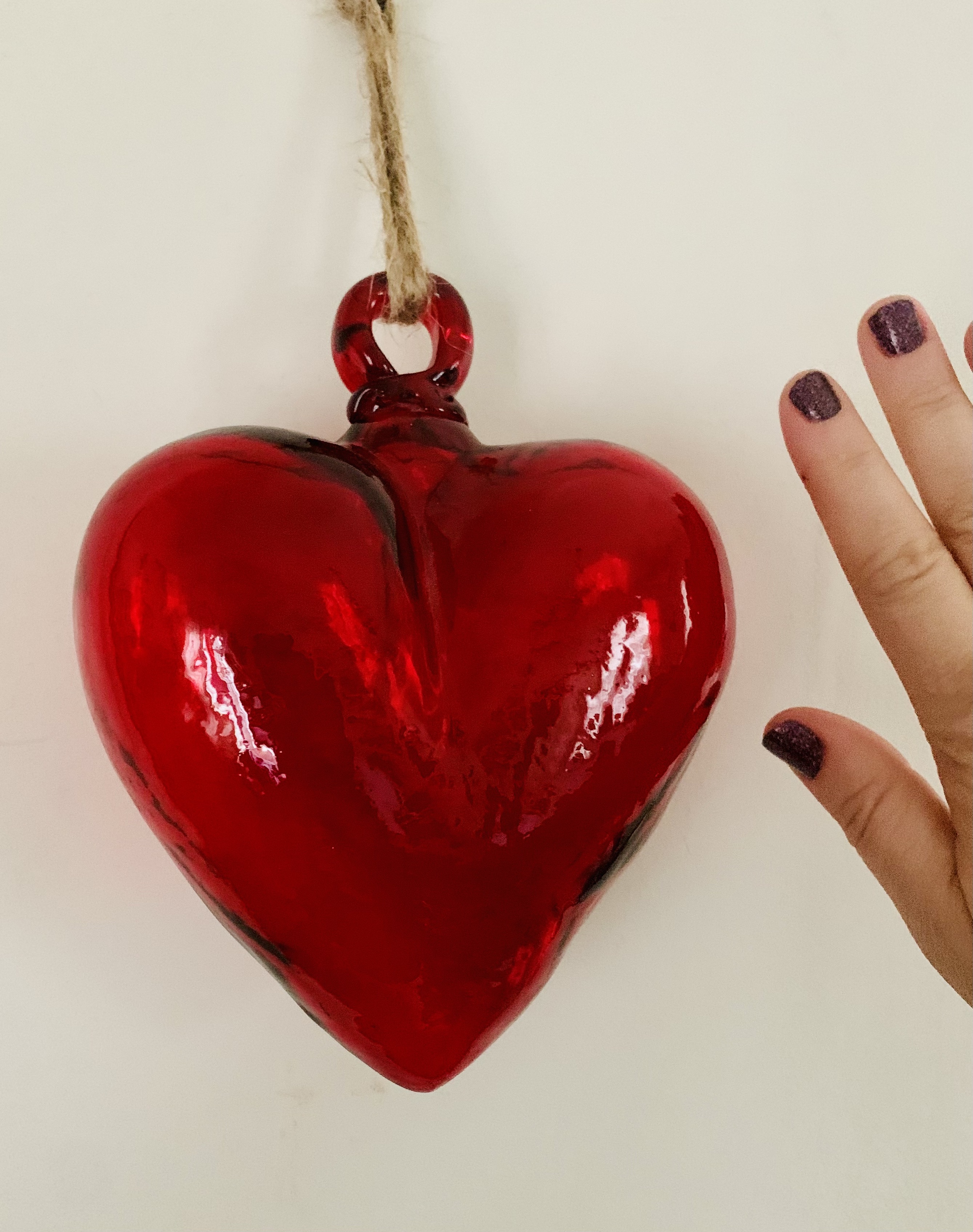 I am looking for a ton of inexpensive Mexican blown glass hearts, so I might, in fact, start decorating a bit for the holiday if I find them, which is not something I currently do. I have two of those hearts already that are up year round, but as they cost $20 each at Market square I’m hoping to pick them up secondhand for, I don’t know, three dollars. (A girl can dream.) And, knowing how this works, I just had to get up, dust the heart hanging on my bedroom wall, and take a picture, with my hand for scale.