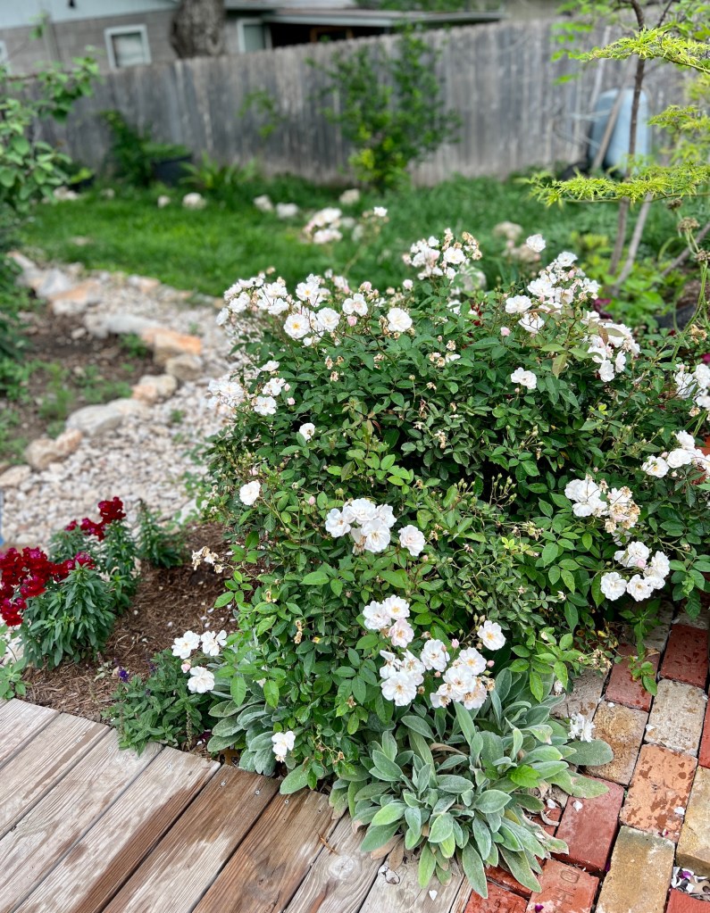It’s Roseville (and not the art pottery manufacturer from Zanesville, OH from 1895 to 1954- zing! Someone please stop me) in the backyard these days! Above is one of the two Marie Pavie roses- just this year hitting their mature size. (underplanted with lambs-ear.)