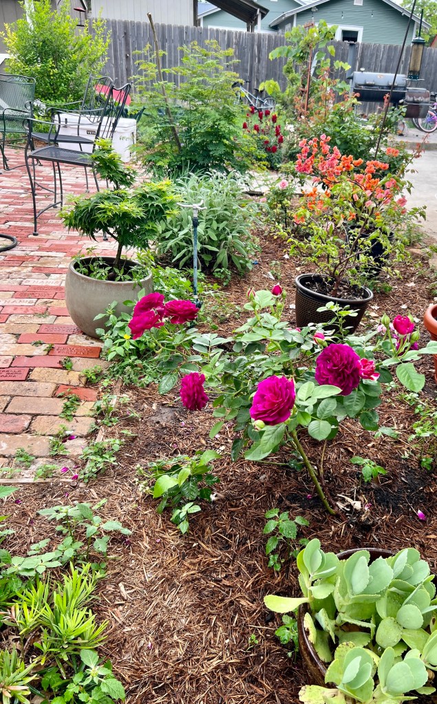 I swear I’ve weeded this bed since this picture was taken. In the front is the Twilight Zone rose- transplanted last year and yet still outdoing itself with blooms. (In the background are red liberty snapdragons and the orange bougainvillea {now there is a word I sure don’t know how to spell correctly on the first 3 tries}).