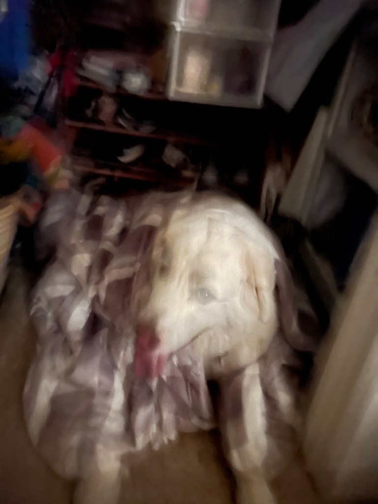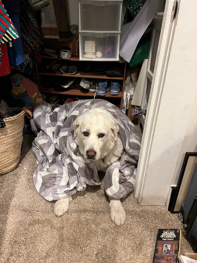 As mentioned briefly above- it rained last night and we’ve had some fairly frequent storms- thankfully, because it was quite a dry winter and we need the water. The only problem with this is that Murphy has pretty severe storm anxiety- so we always have to set him up in the one of the closets in our bedroom to ride them out. I’m not sure why he’s picked those particular closets as his safe space- they’re on exterior walls, but it’s where he goes every storm. The storm below was particularly thunder-y, so he got wrapped in a heavy blanket as well.