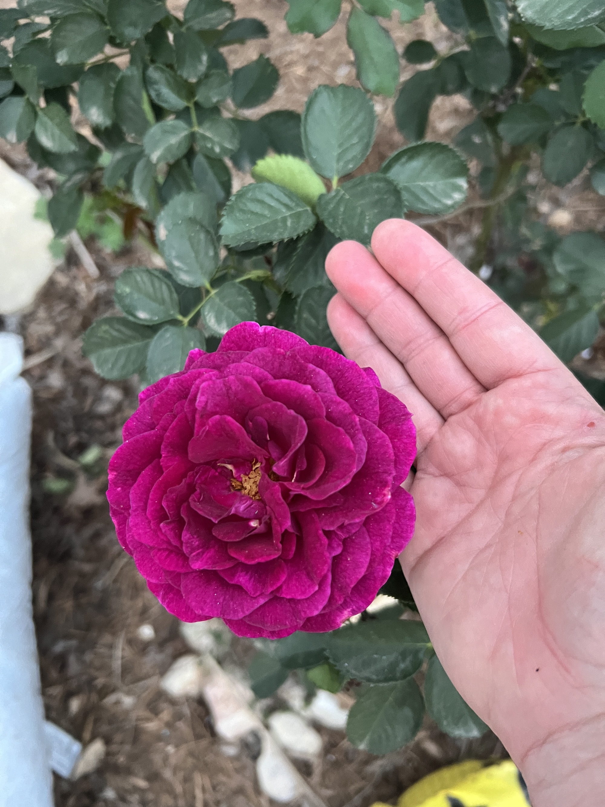 The Twilight Zone has some of the largest flowers of any of the roses in the backyard at the moment- and as always the color is impossible to capture correctly- it’s more purple and less fuchsia (ditto on not knowing how to spell that one), I promise. Yes, that was a rose thorn in my palm in that pic- I got it out right afterwards.