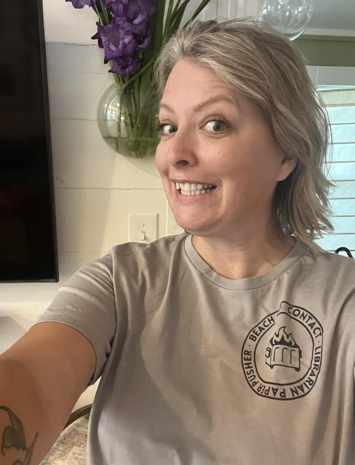 But can we talk about the shirt my friend made me? She spent a truly amazing amount of time creating the logo that not only says “Beach of Contact” but has a dumpster fire as well as the phrase “Librarian paper pusher” on it.