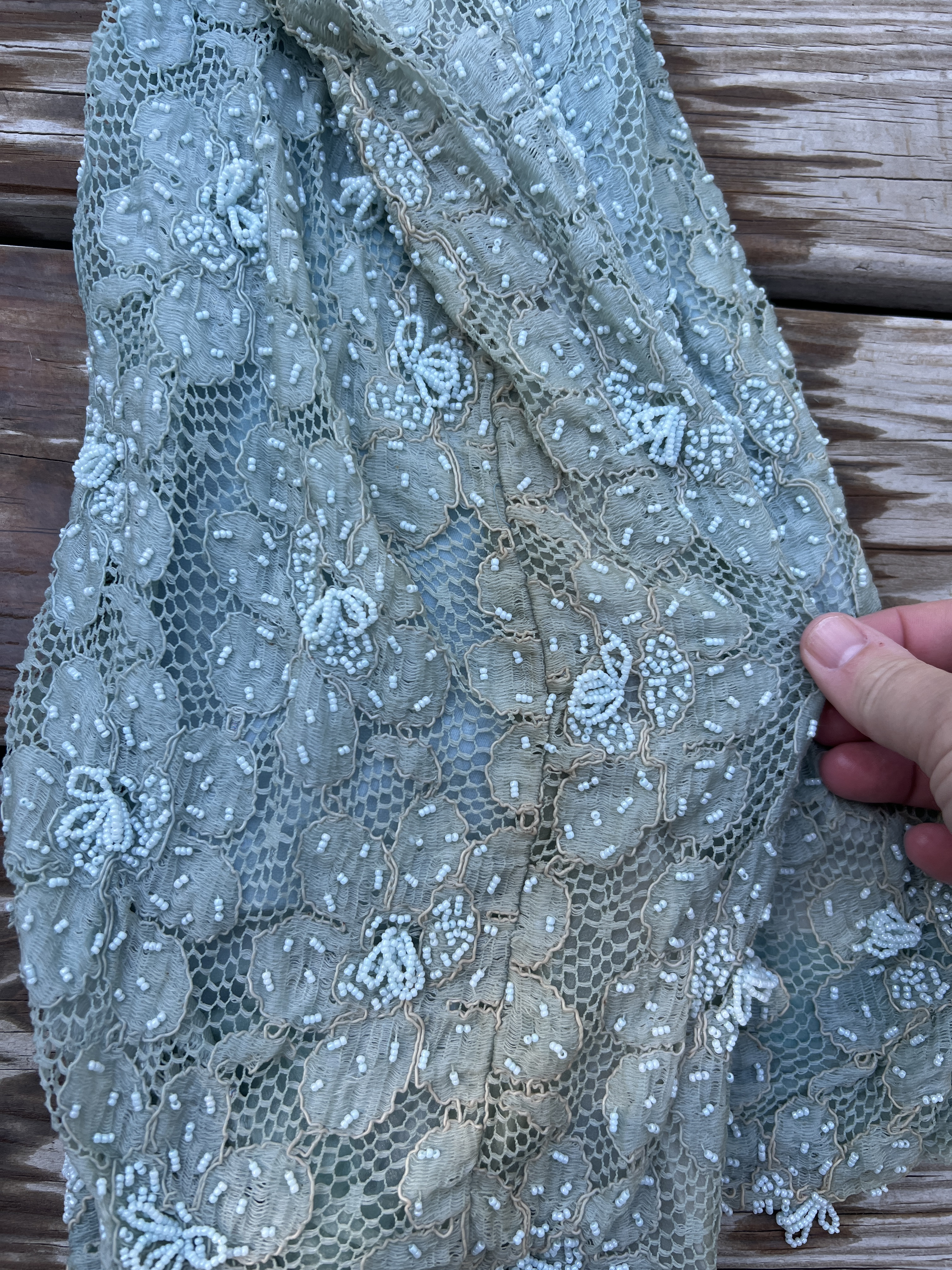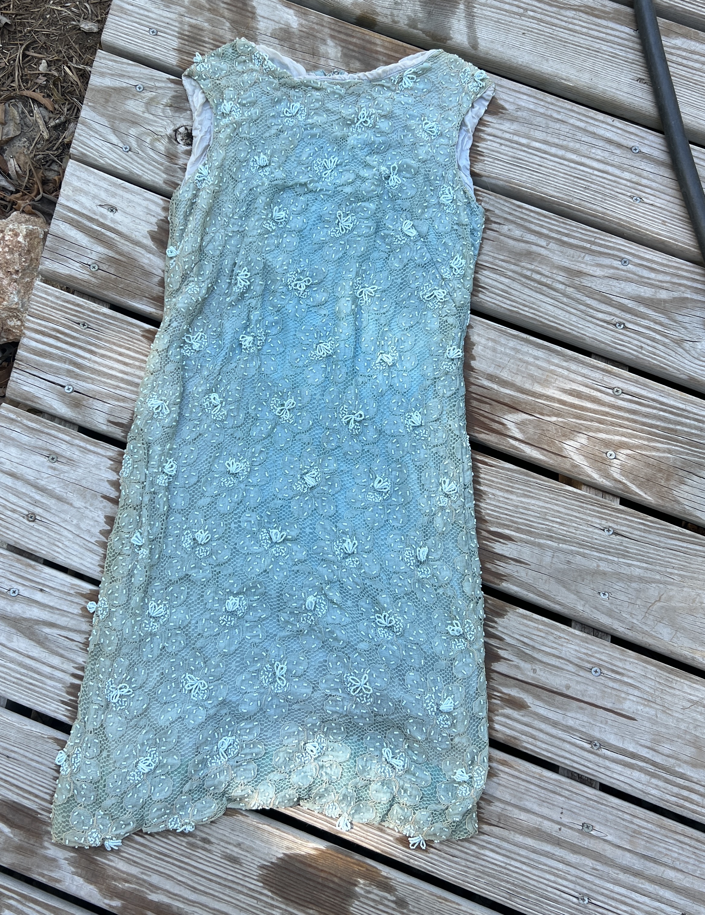 In other news: reselling is going well. Periodically I do in depth analysis on what is the most profitable so I can be sure I’m maximizing my time and efforts, and found that vintage clothing is still in the top 3. (Art is #1, and Pottery and Glass is #2. Ethnic items are #4) And so, when I found this faded and stained beaded 60s sheath dress I knew there was potential. The beads were in great shape, the zipper worked… just the color was faded and it smelled like smoke.