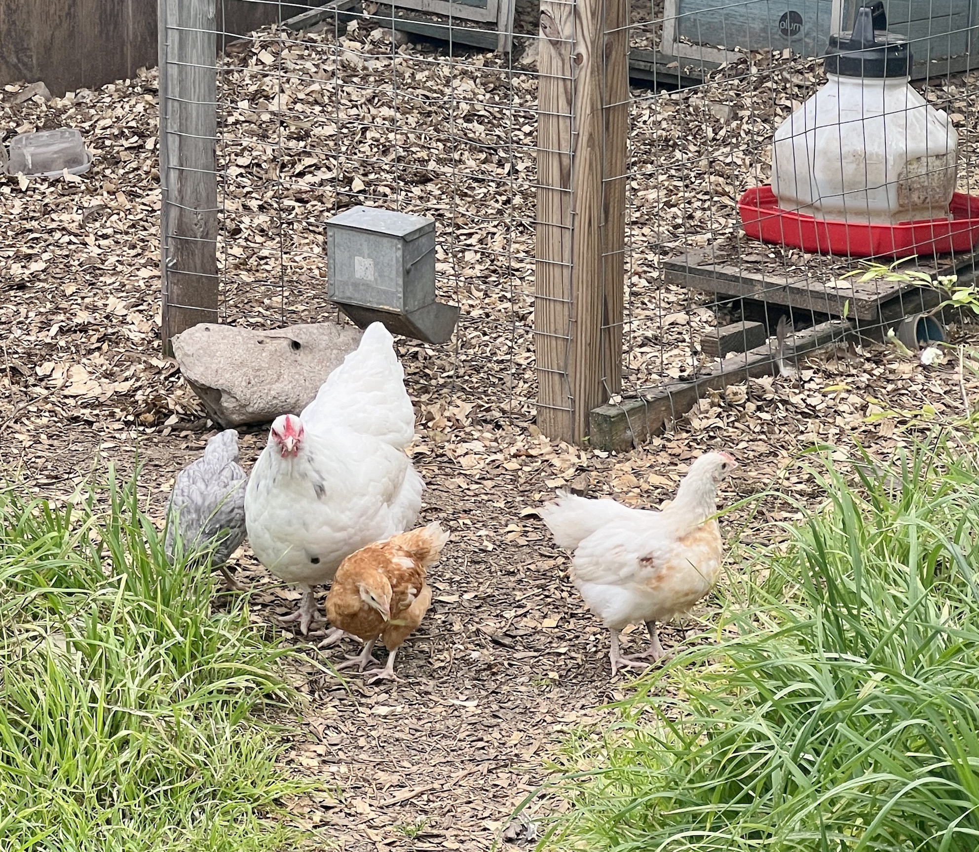 There is Ricotta and the three chicks we ended up keeping. (Gave the other 3 extras to my husband’s aunt and uncle- they were all solid brown.) Adorably Ricotta has adopted them like her own chicks; it’s a dynamic we haven’t had in the backyard before and it is maybe (no it’s not) worth the struggle of the rooster thing and them being so small for so long. They have grown enough to at least not fit through the wire mesh anymore, so that’s nice.