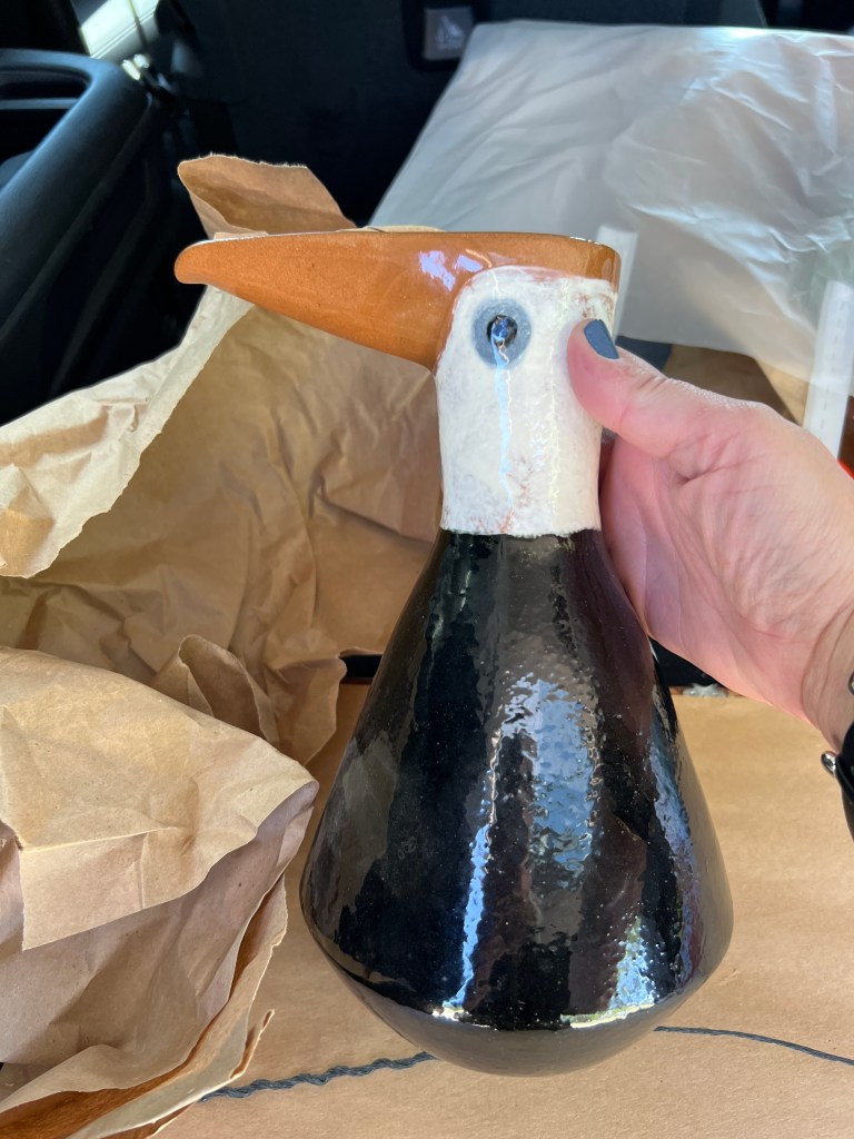I put it on the hold table. Then didn’t trust it wouldn’t get knocked off so I picked it back up and carried it with me the rest of the sale. I don’t really know why. It didn’t have any markings or signatures. The glaze looked mid century to me, so I figured it had some age. But I tell you, that thing called to me.