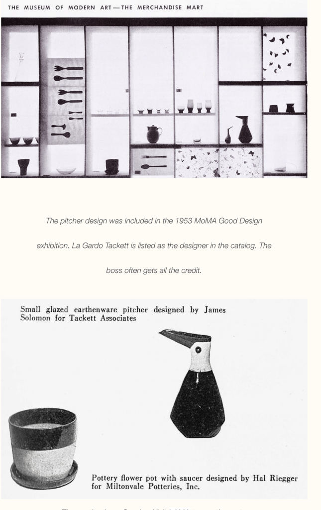 So that is a Lagardo Tackett pitcher (designed by James Solomon) from 1953. There it is up in the MOMA good design exhibition back in the day. Research showed me there hadn’t been one sold since 2011, at least not that I could find.