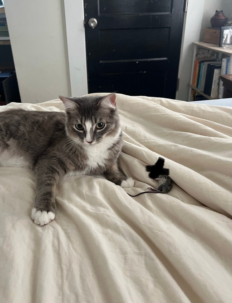That mouse was the first thing he has ever caught- and there does exist a part of my brain that feels so, so loved by the little jerk- he put so much effort in to a gift! For my birthday! To make me feel better! I imagine him saying: “I made it myself!” As he dropped it on me- so I do appreciate it but please god don’t let it turn into a habit. Appreciate me less, cat.
