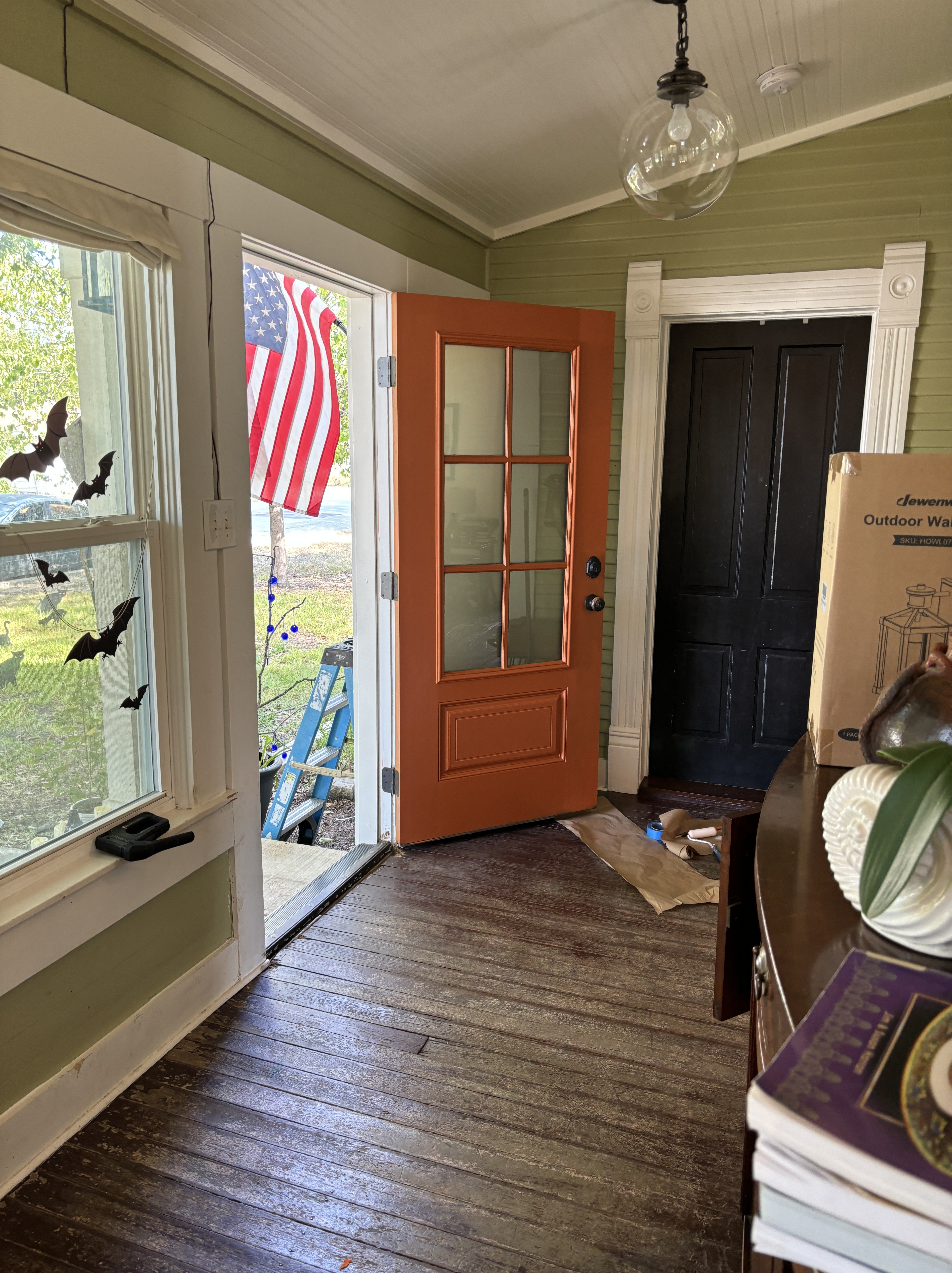 It isn’t my alma matter color, though it is burnt orange, for the simple fact that I think the University of Texas has the worst color orange ever… and also I wasn’t going for school pride with my door, anyway. It was originally a dark brown, and so it drastically changes the look of the front in a “significant refresh to the whole thing” way. Y’all will remember I originally got the paint and was planning to do it myself and then I totally didn’t. Is cool- I shall use the painting money for painting- it seems appropriate.