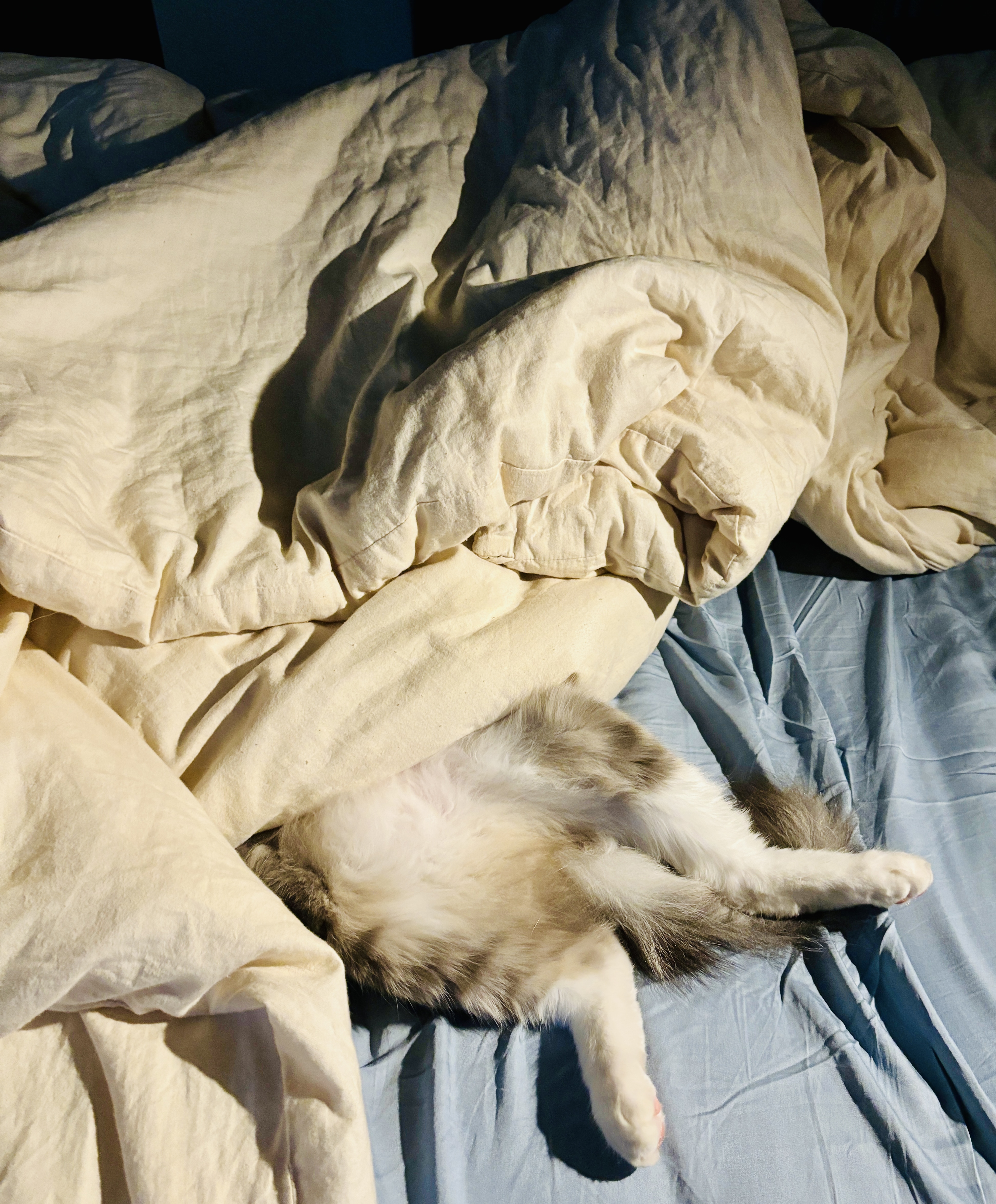 SOMEONE finally remembered he’s not a stray and started coming in again. Alabama did this last summer too- he and Lacey must like the intense summer heat because they both didn’t step foot through the cat door from June to the end of August, the weirdos. But he’s back to his spot at the foot of the bed for the last month.