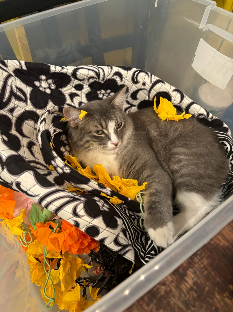 I guess we’ll never know who got into the bin and shredded damn near all my meticulously collected paper flowers, now will we Asher? It’ll remain a complete and utter mystery. So there were very, very few flowers to make an arch out of this year. Maybe I’ll get more today. Anything is possible, I guess. (Note from the future here: I did make it to Market Square, and bought an ass ton of new flowers. Asher has already destroyed one.) It isn’t our best this year but I’m thinking that fact is pretty understandable.