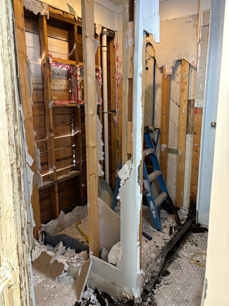 Yeah. The only part that isn’t rotted and mildewed is that back wall- which, fun fact, is the exterior wall of the house and the reason that’s not rotted is because you can see sunlight through it and it was able to dry out I guess, thanks to the airflow. And yes- they GLUED TILE TO THE WOOD SIDING to make the two niches in the shower. So that’s fun to find out.