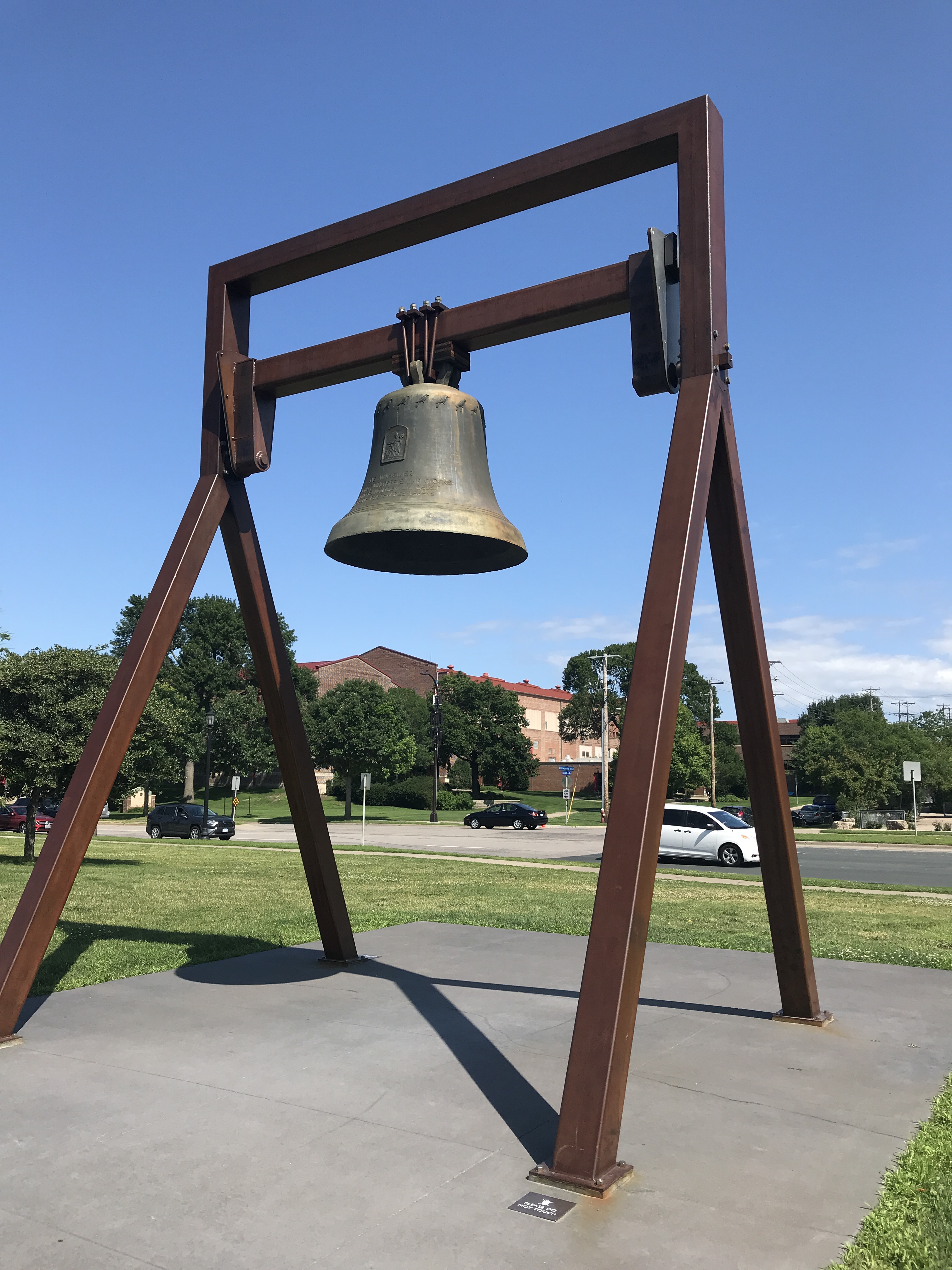 Title: For Whom… by Kris Martin. It swings on the hour and has no clapper. A silent bell, swinging, and then stopping. It captivates me. Spoonbridge and Cherry can suck it in comparison. Minneapolis Sculpture Garden