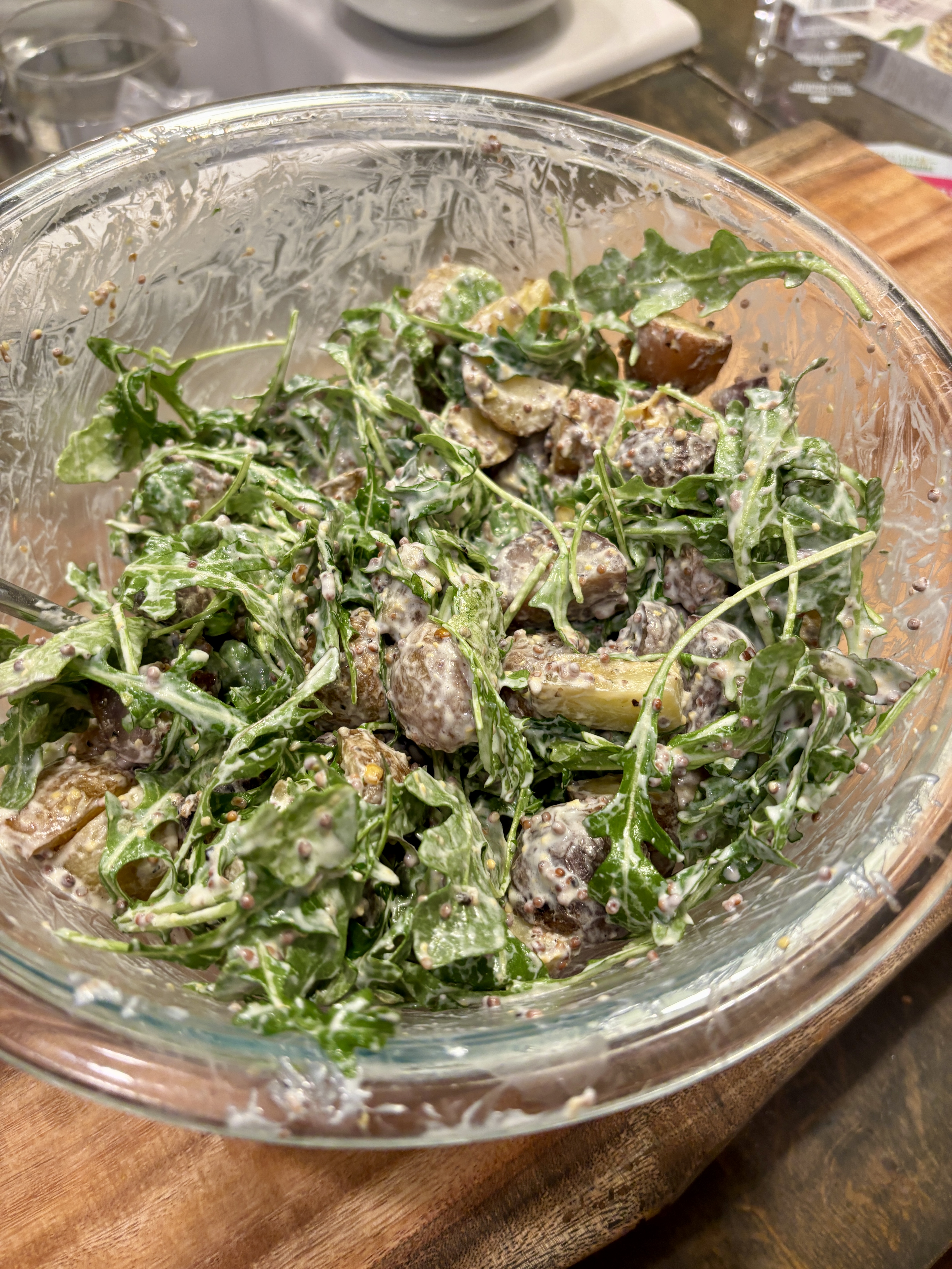 The salad is good as well: roasted baby potatoes, tossed with fresh arugula, bit of mayo and seeded mustard. I put a lot of seasoning on them before I roasted the potatoes, so it didn’t need any extra salt or pepper.