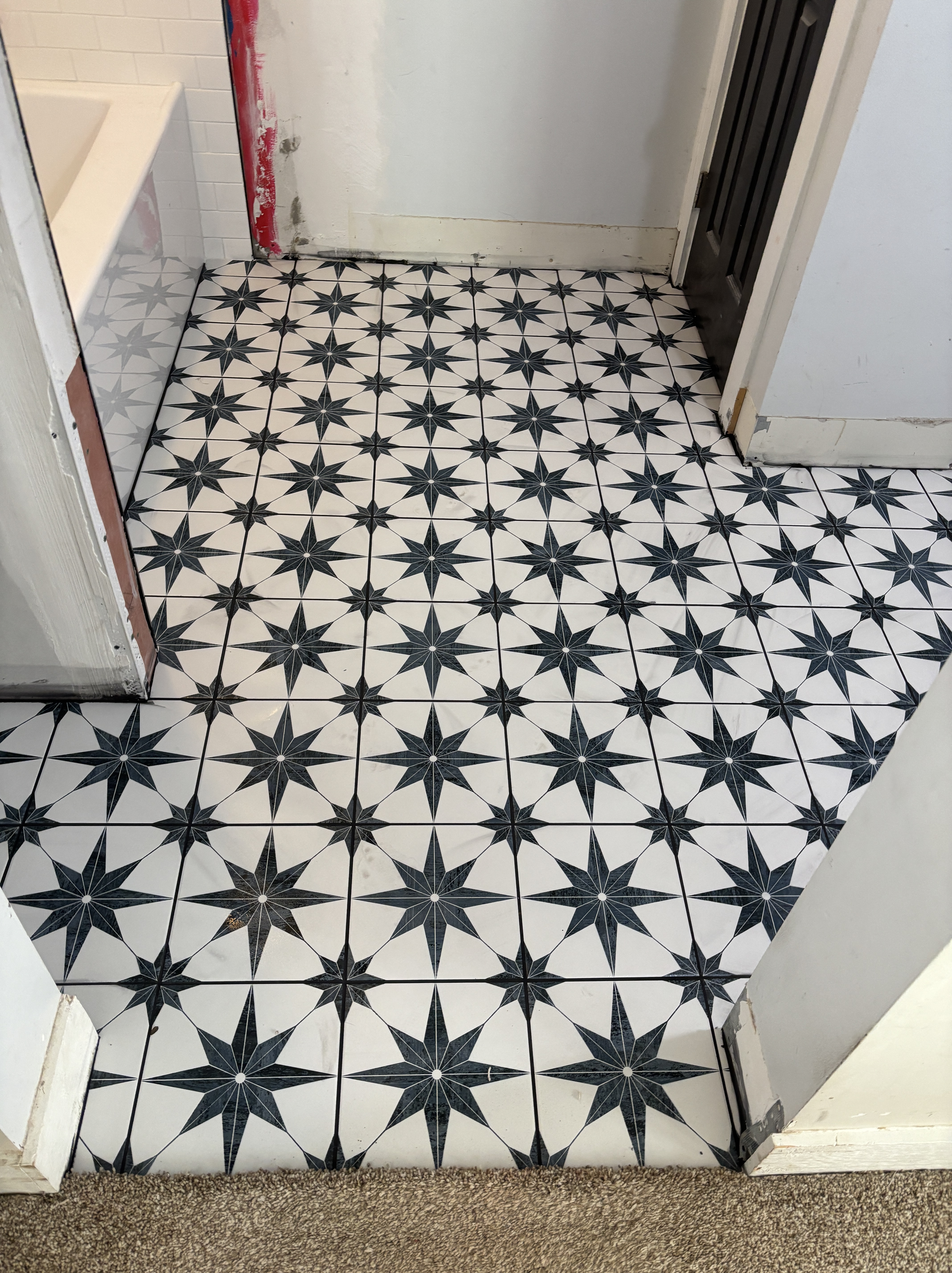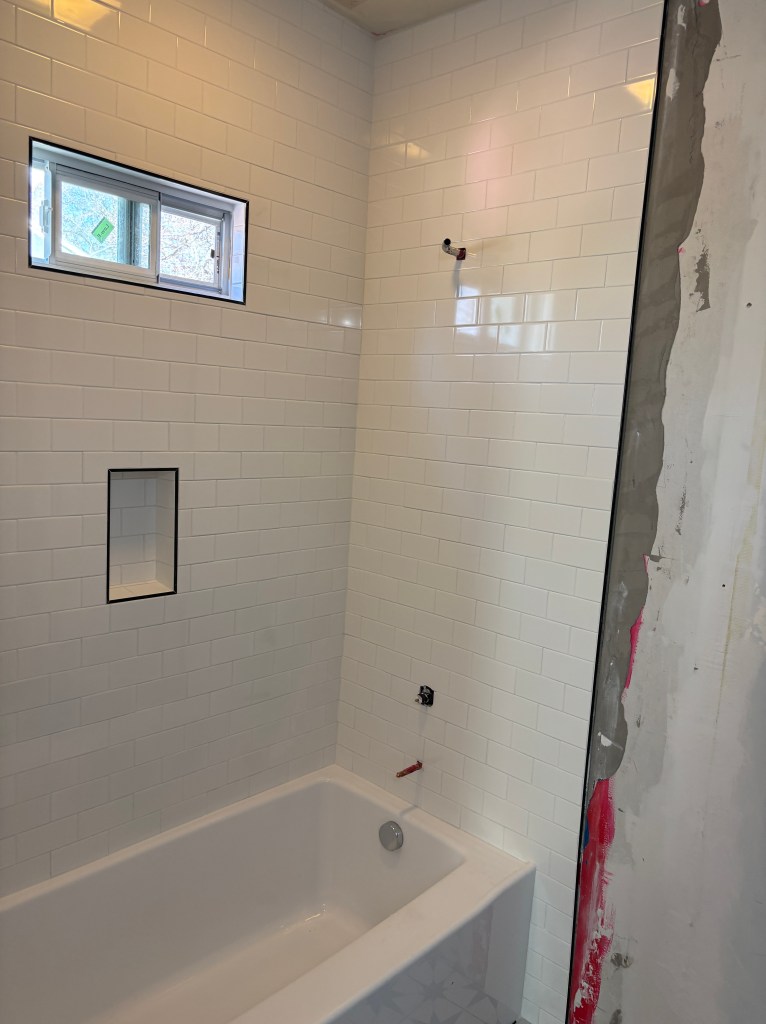 And the plumbers are here today to hook up the tub, toilet, and vanity. The drywall and paint still has to be done. But functionality at least should be pretty forthcoming. And the tile turned out soooo nicely!