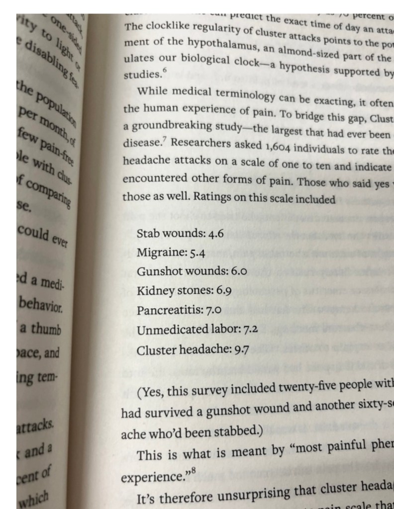 Here is a pain scale on cluster headaches- not to in any way to minimize the debilitating nature of migraines, but to convey the extreme level of pain that come with cluster headaches.