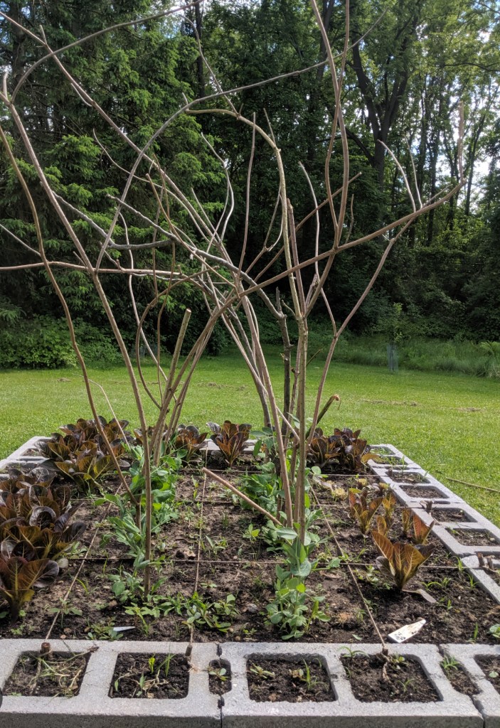 I then put some upright branches through the whole thing. This is an English technique called “pea sticks” and is to keep floppy plants from breaking. Its way more attractive than tomato cages or rows of twine held up by t-posts. (Not a strong enough support for the actual tomatoes though, unfortunately). The pea sticks are VERY needed to keep the cosmos from breaking- I do it every year for them- so I just extended it to the rest of the vegetable garden to also serve as “jerk dog” protection.