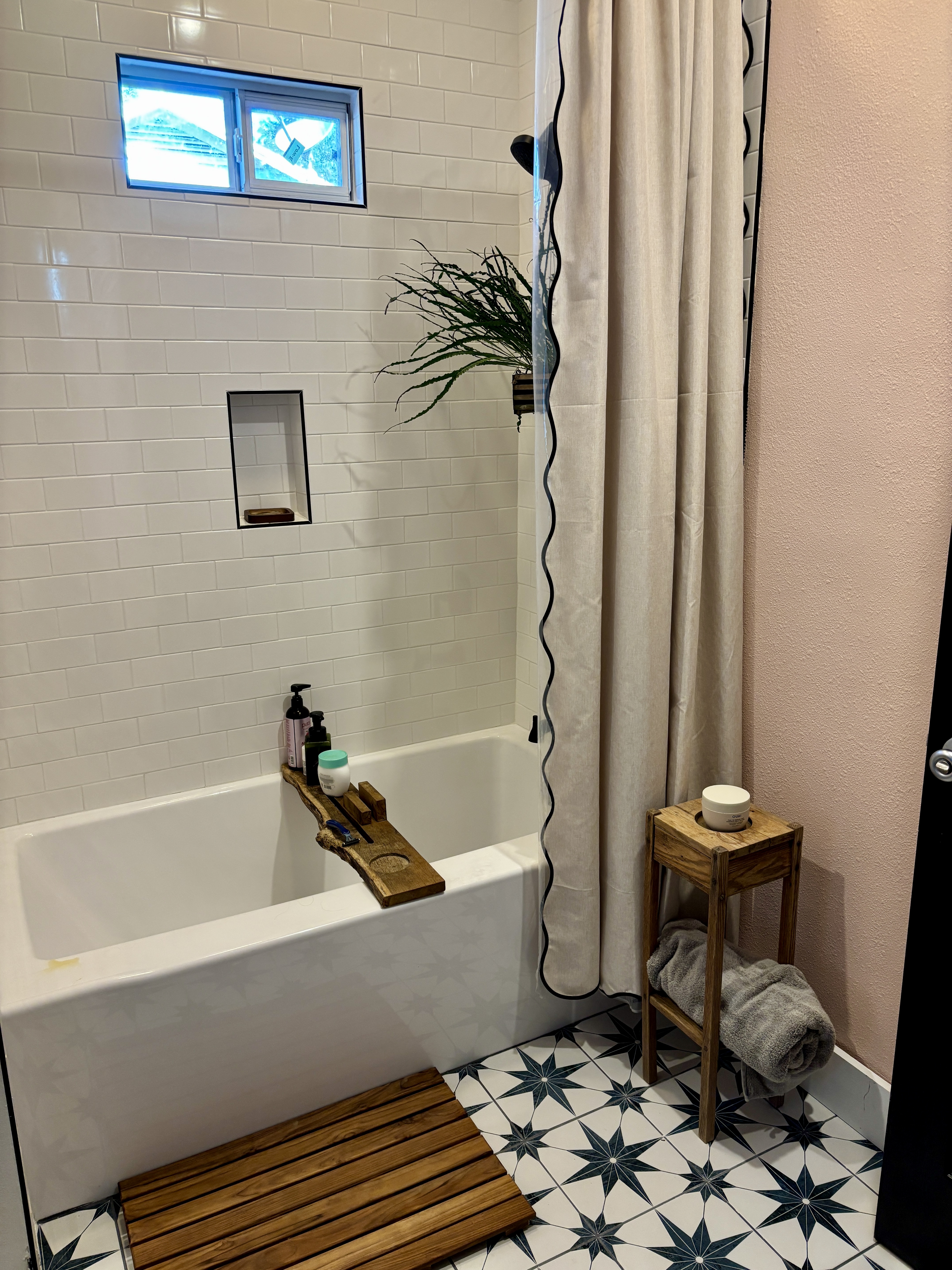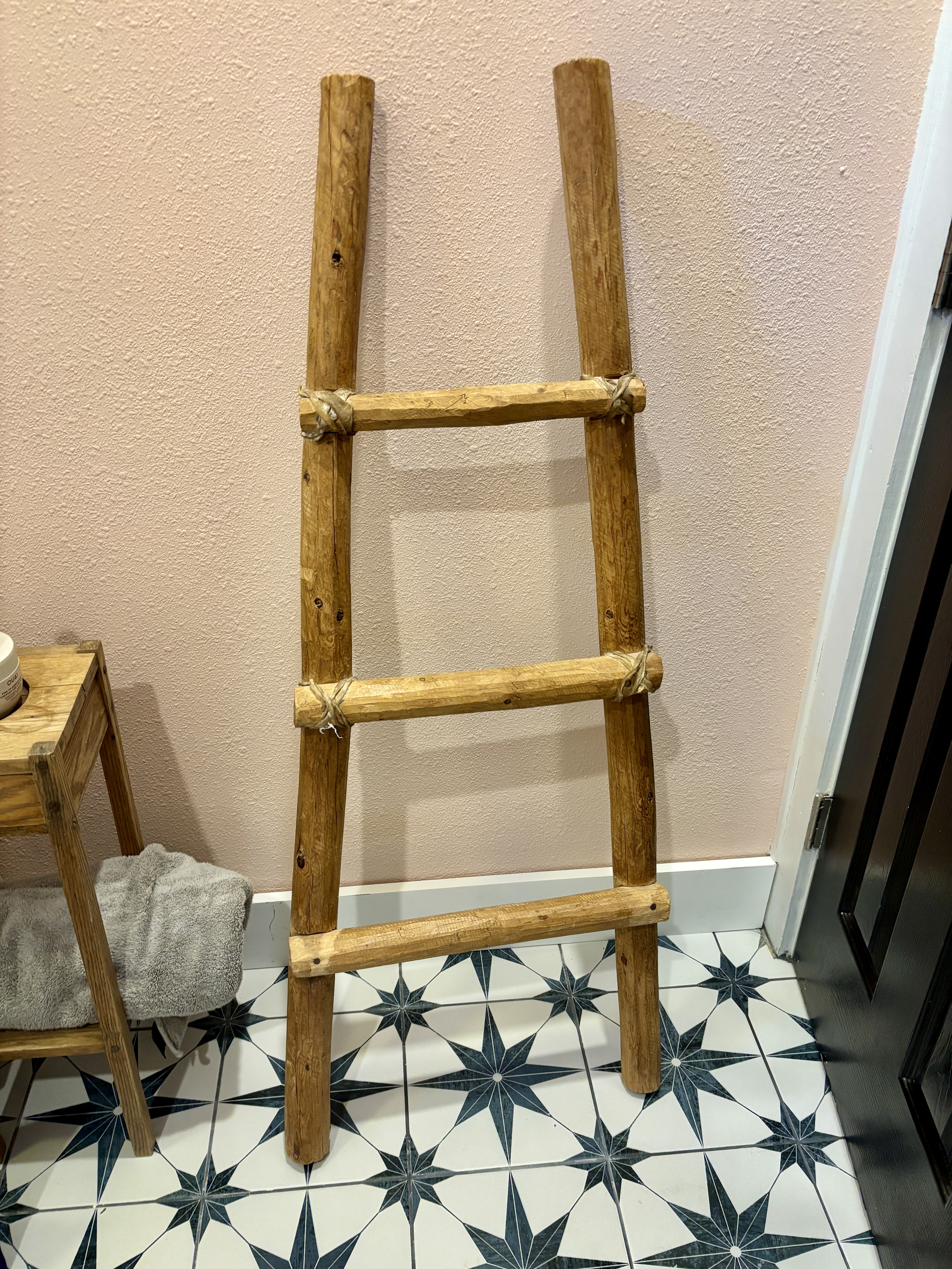 I’ll be mounting this 4′ wooden ladder on the wall next to the tub as my towel rack. I got this at an estate sale for $30 two years ago and always intended to use it for this. It’s finally getting done.