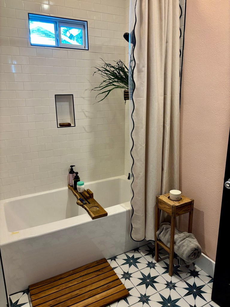 You’ve got lots going on and that’s probably helpful for all kinds of reasons. I like your bathroom, it’s shaping up nicely. I’m a little unsure of the plant, though. I would accidentally knock it over or down, then have to clean it up and I wouldn’t like that. Boo to cleaning crap up.