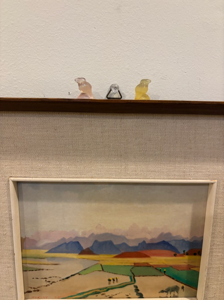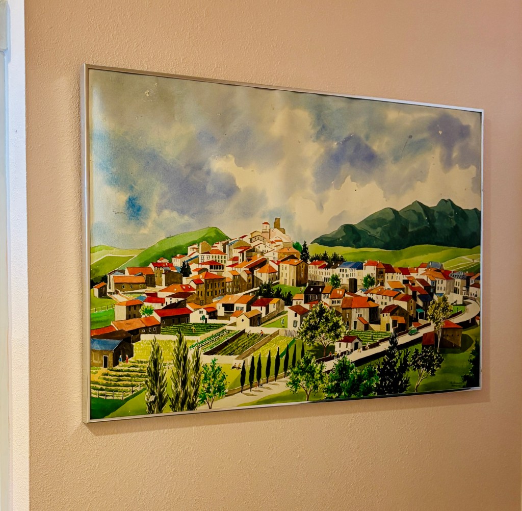 Here is the 1950s watercolor I am putting in there for some art, also got this about two years ago. The scene looks Italian, but the back names it as a town in southern France. I’ve always liked it, though the clouds are a bit amateur. And all my advice to base your room colors off of your art did help me decide between the two different pinks I has swatches of, as I chose the one that went with the painting better. (the color is off in that pic, the wall is less tan and truer pink than that. And it does match some of the highlights on the roofs in the painting, though I know even the highlights all look orange in that shot…)