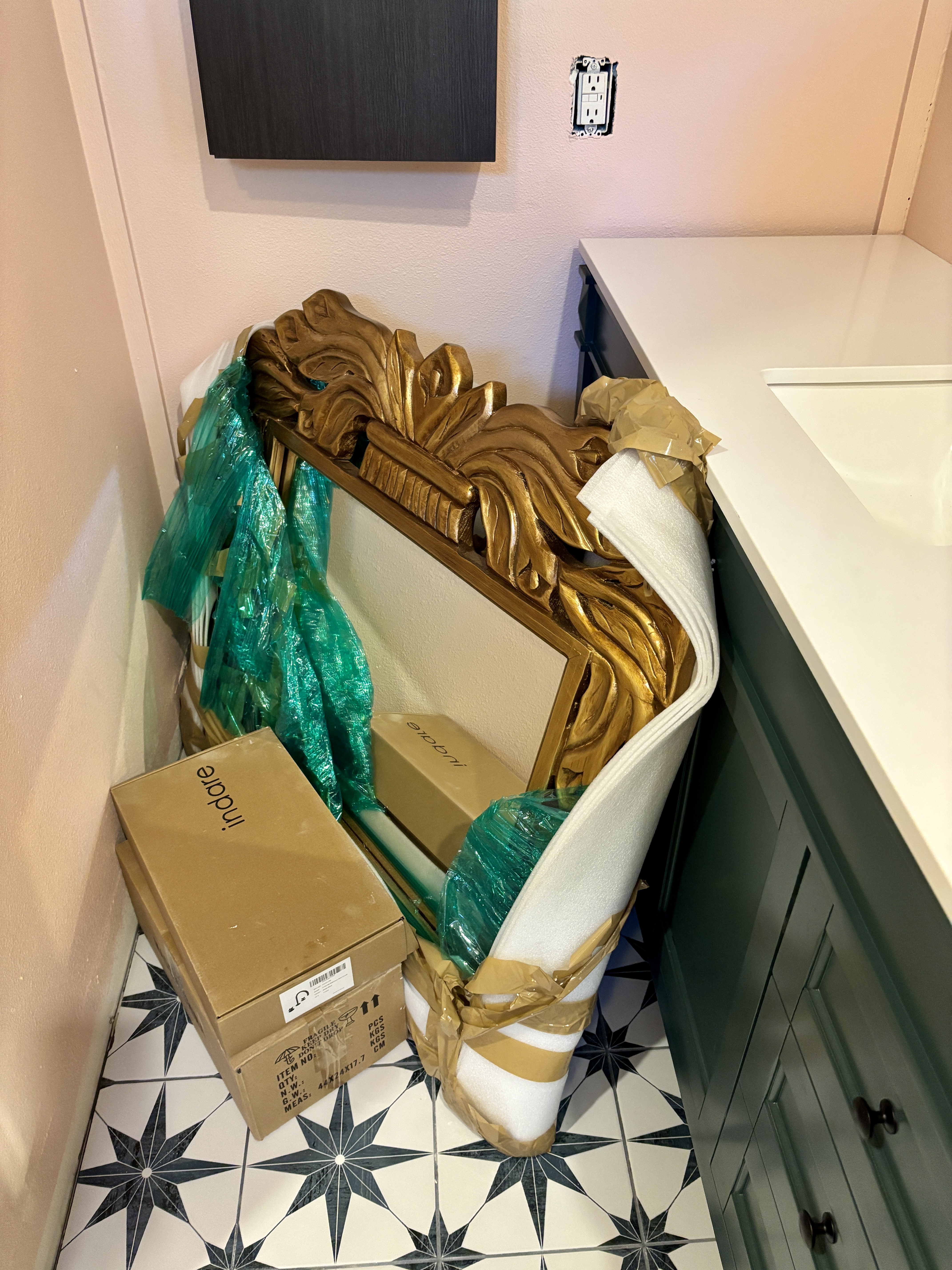 This is my gilded wood antique Mexican mirror I bought online in the summer and then didn’t open for 4 months… so good thing it wasn’t broken. I paid over $100 for shipping. Lucas would have choked on spending that (not to mention the amount it like, cost) and so should I have… but that was in my “presents when you don’t have presence” phase so I was buying literally whatever I wanted the second I wanted it… mirror and floor tile included. My finances are okay. They took a hit, but they can just join the fucking club with everything else that is true for this past year too, you know?
