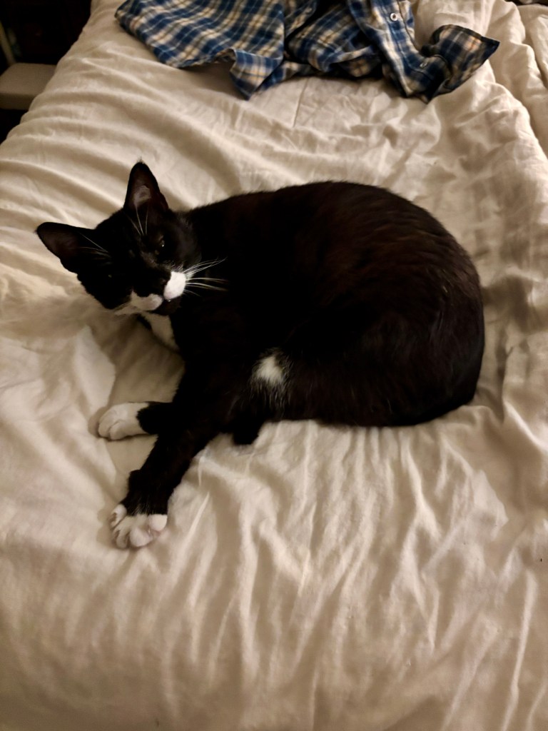 Alabama is so polite. He may come up to the head of the bed briefly for some head scratches or to aggressively knead for a minute or two… but otherwise he’s curled into as small of a ball he can make himself on the opposite bottom corner of the bed. He has never crowded me once in his entire life.