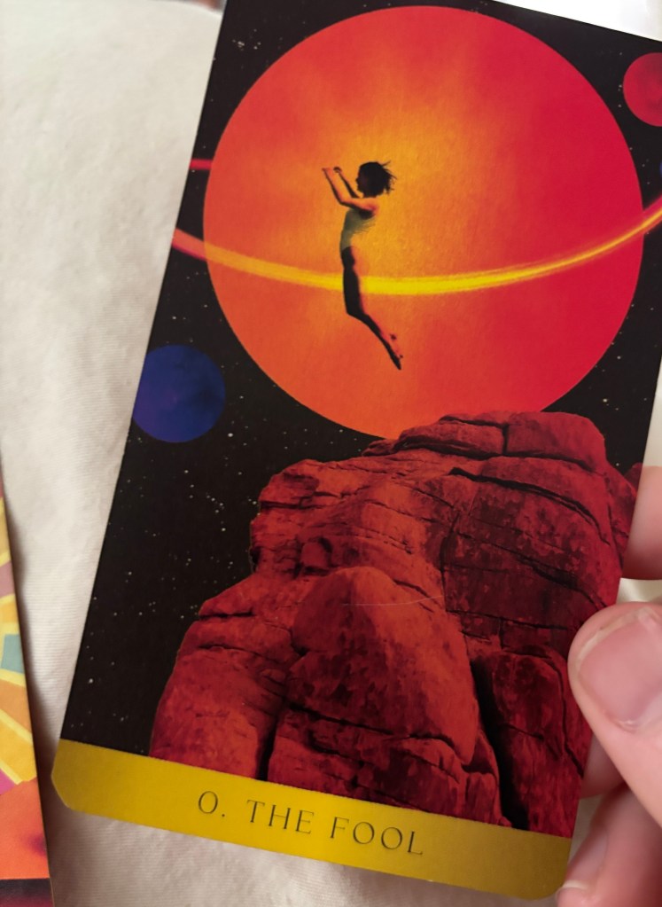 Every SINGLE tarot pull lately (I have my own cards- this isn’t costing me $30 a pop, mind you. Also in various decks, not just this one. Yes I have a collection- don’t judge.) has The Fool card show up. Which DOES feel like the cards calling me names (Pfft. Look at this asshole out here…) but is actually a card of new beginnings, new journeys, and unknown possibilities.