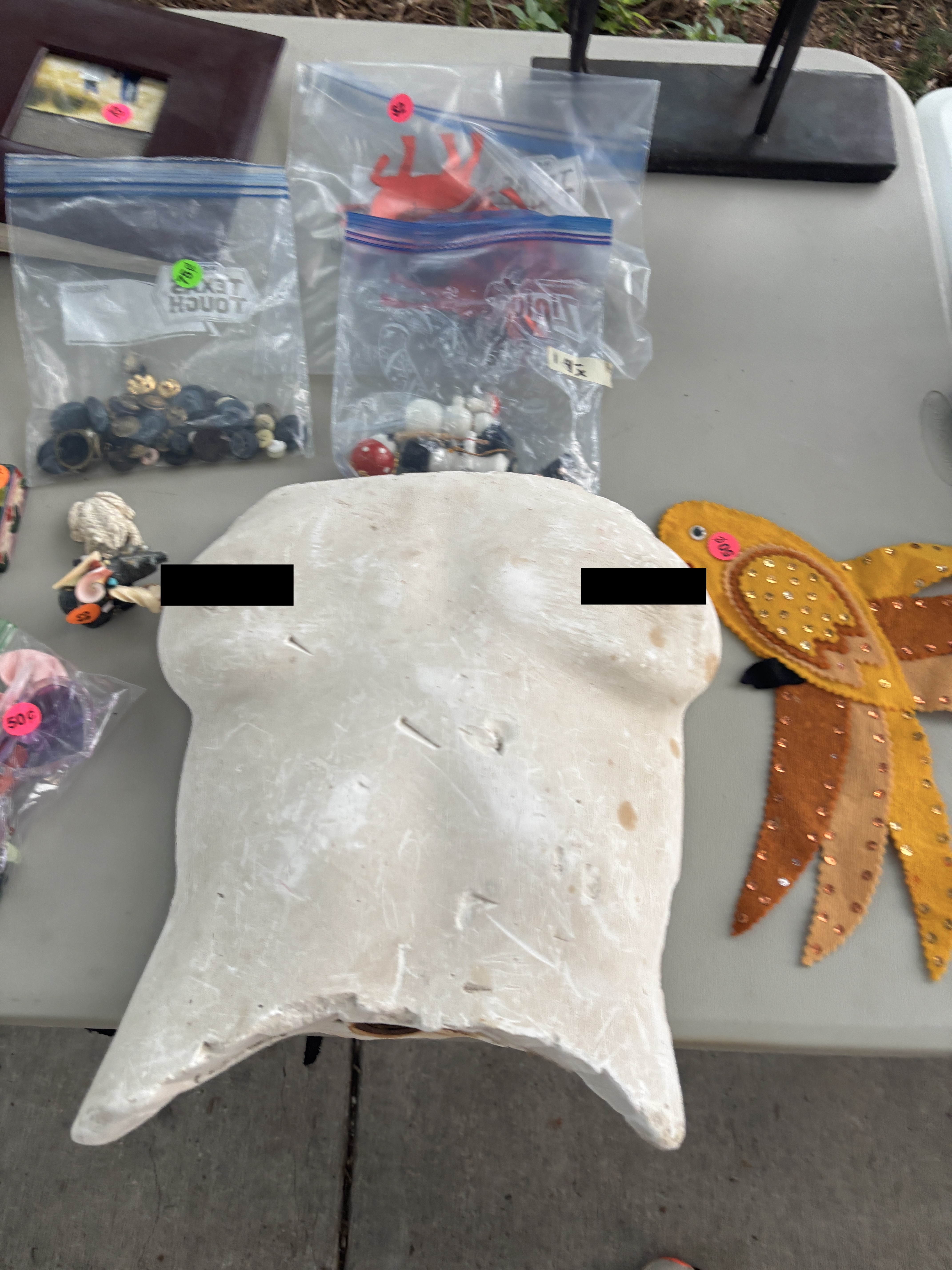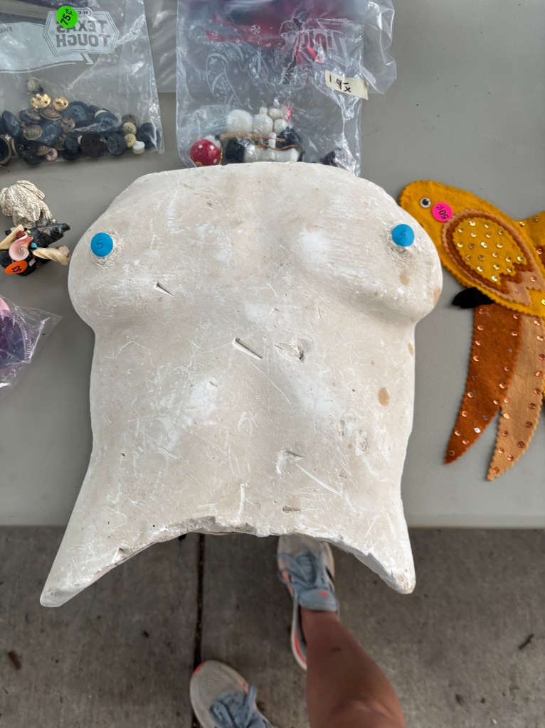 After being taken down from the living room, the boobs then moved into the box of Christmas stuff for some reason for the next 30 years or so. And then I stumbled across them again with all the boxes of clothes Dad had me sell at a garage sale this weekend. Slipping one last trauma in under the wire… thanks Mom.
