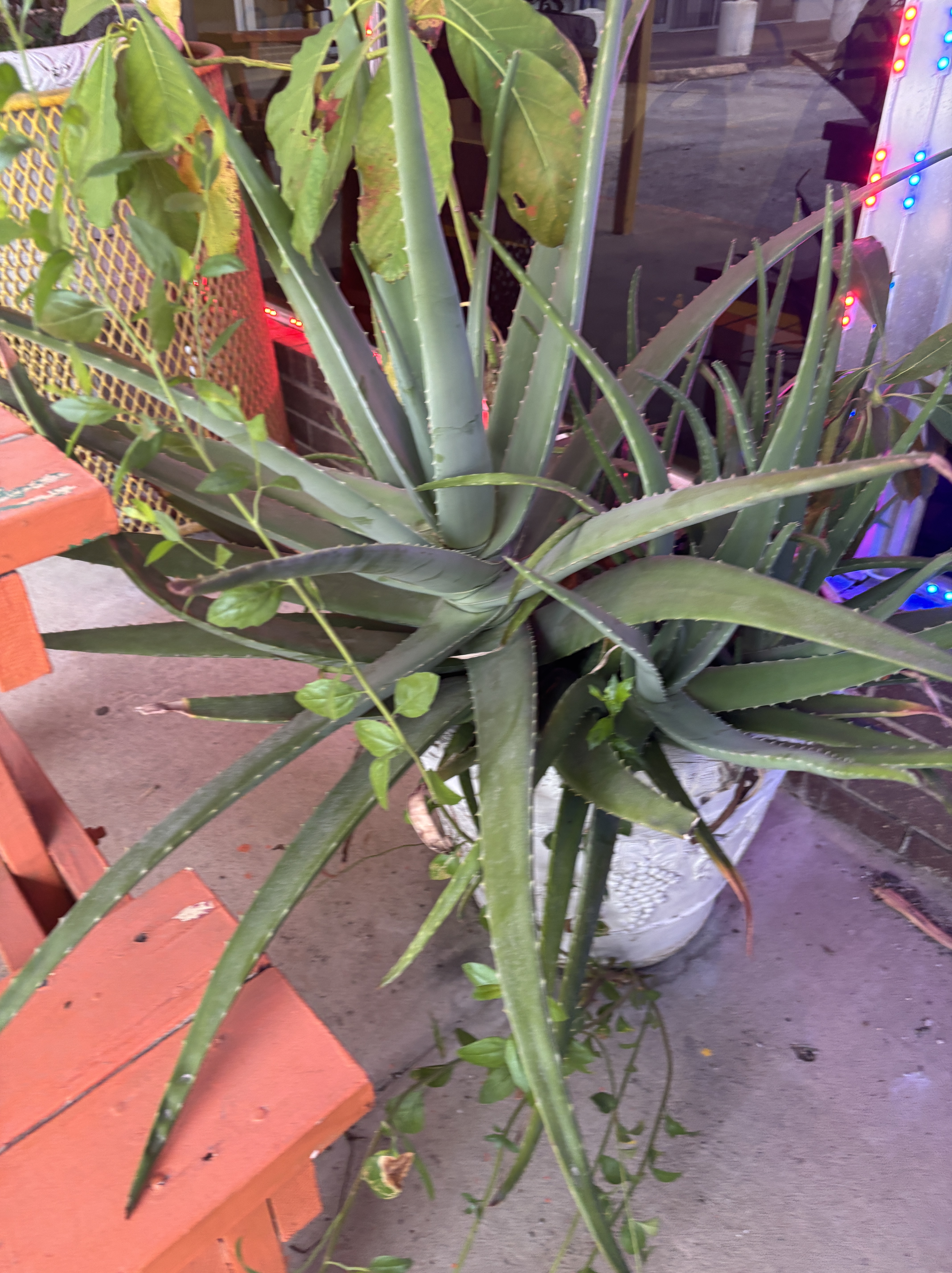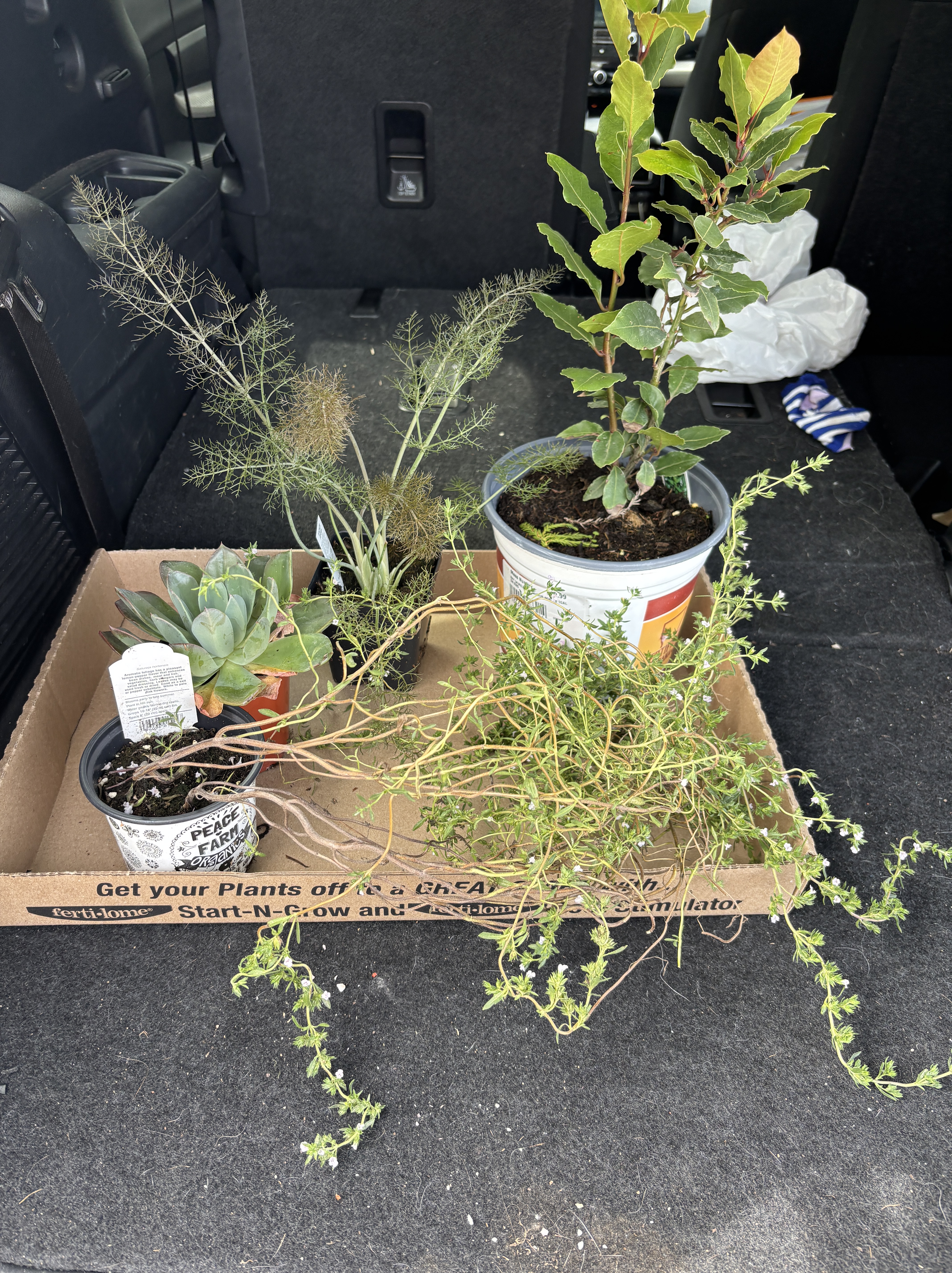 That is, left to right: His kitten, French Fry. A huge aloe at a Mexican restaurant where I got us breakfast tacos. The plants I bought when I got out briefly to a nursery. And some detangler his daughter uses that I liked and wanted to google later.