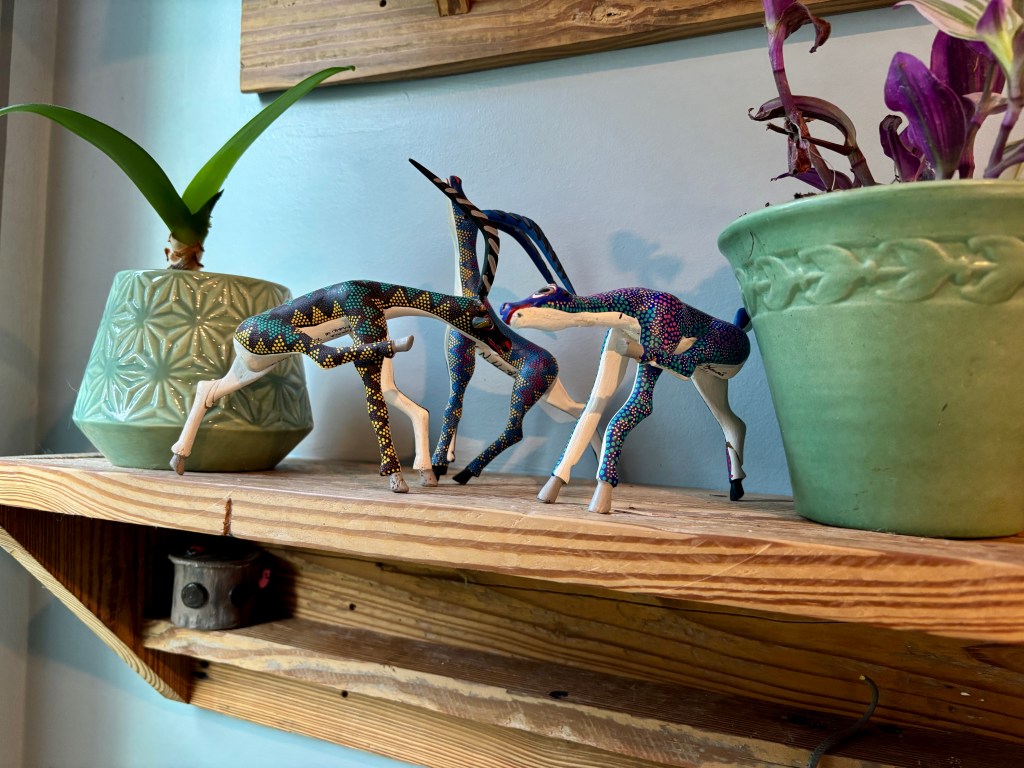 Next up we have another orchid, in a new pot this time, but its one my sister in law made me for my birthday this year. Then my beloved Innocenté Melchor deer alibrejes… not a one that isn’t rougher for wear over the 20+ years I’ve had then, but my favorites still. And then next is a purple wandering jew plant in my favorite vintage pot. It is unmarked and while it LOOKS like Rookwood, it is most likely not Rookwood… but I love it still. You can tell what color vintage pottery I like most at this point, I’m sure. On the shelf within a shelf under it is another clay box my middle daughter made me- this time of a tree trunk. It has a ladybug on it you can’t see- I turned it once I realized it doesn’t come through in that pic.