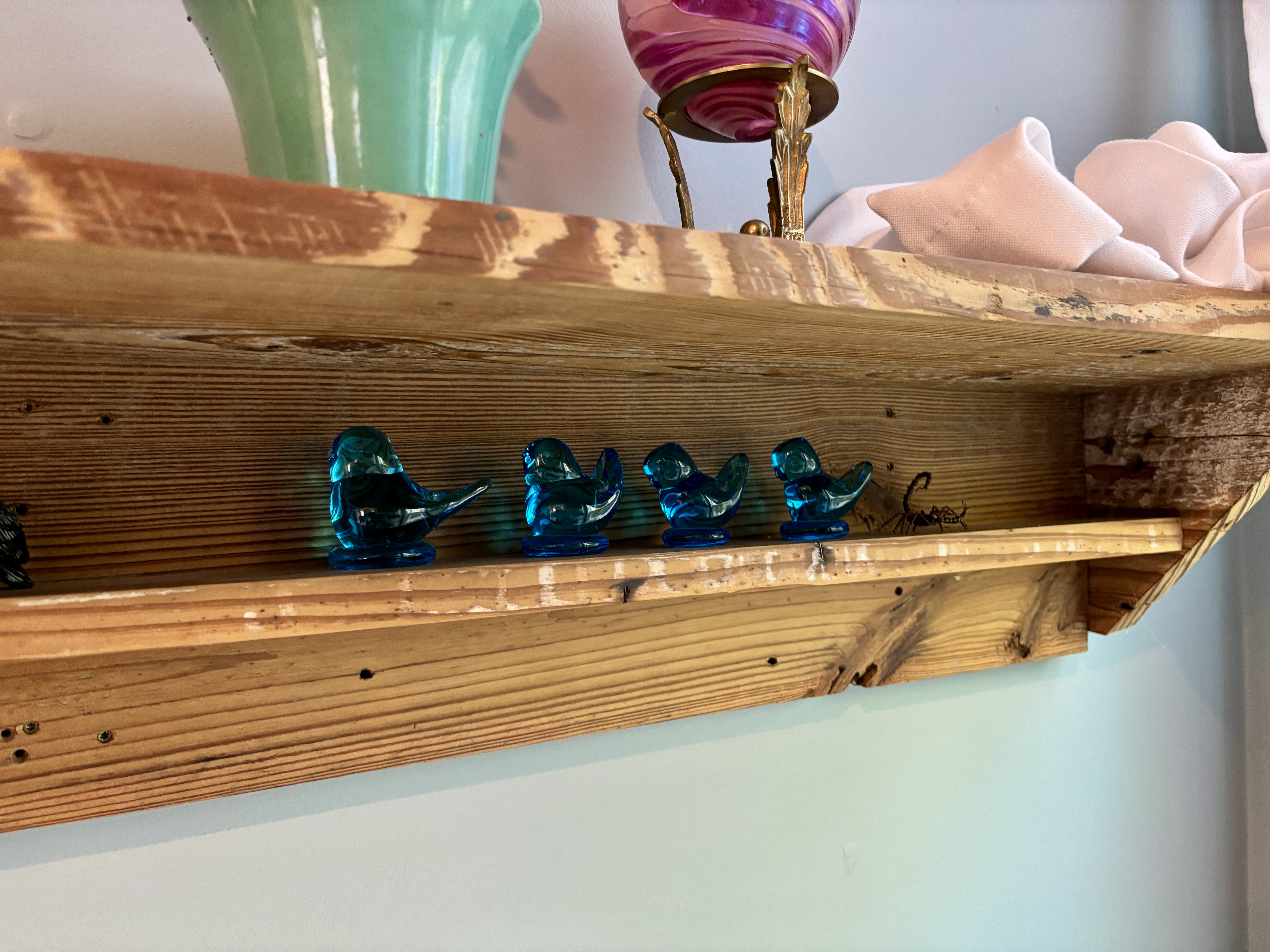 The little bird figurines in front of it are painted seed pods from Africa I got from an artisan in Portland on a work trip in 2018. To my mind they are my husband and I, if we were seedpod birds from Africa… not sure why that makes sense but it does.