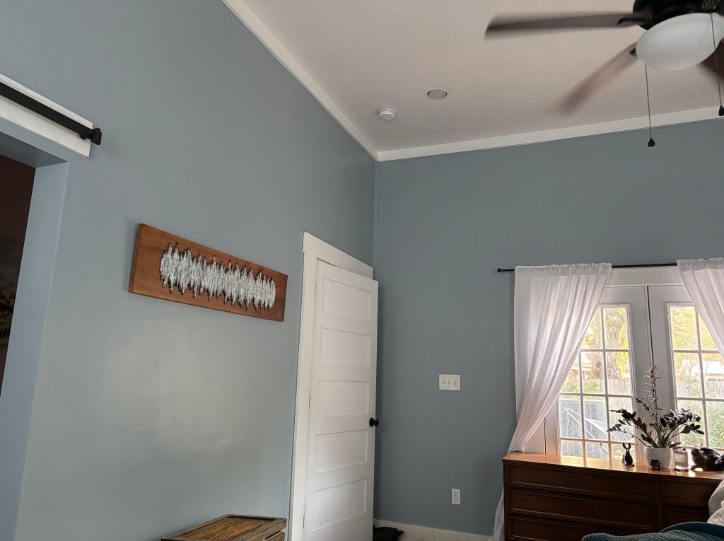 My husband and I hated beige walls. And flat paint. And yet our bedroom never got painted since we moved into this house. It’s a large room, and needed some drywall repair from damage sustained before we replaced the roof… and we never could hit on a color… excuses were many. But the time was nigh. This was happening.
