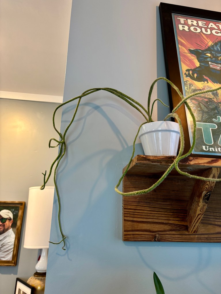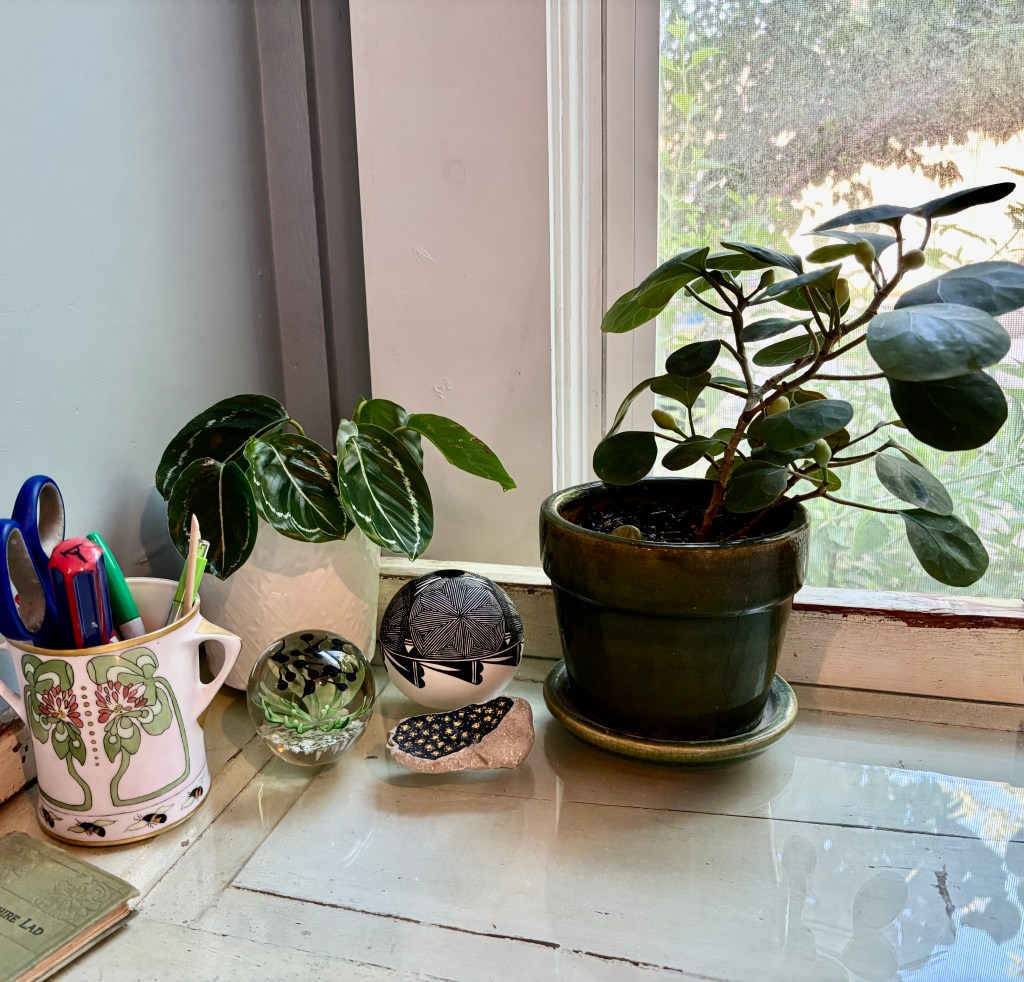 Next to that is a handpainted Acoma vase my husband got me for Christmas in 2023, and a rock my oldest painted one summer the three kids really got into that. (There are many still scattered around the garden). The plant in the green pot is an eyeball ficus and it’s tripled in size in the 5 years I’ve had it. Bought that plant from a greenhouse on Valentine’s Day in 2020 with my husband. Was a lovely Valentine’s Day we played hookie and spent the day knocking around while the kids were at school.