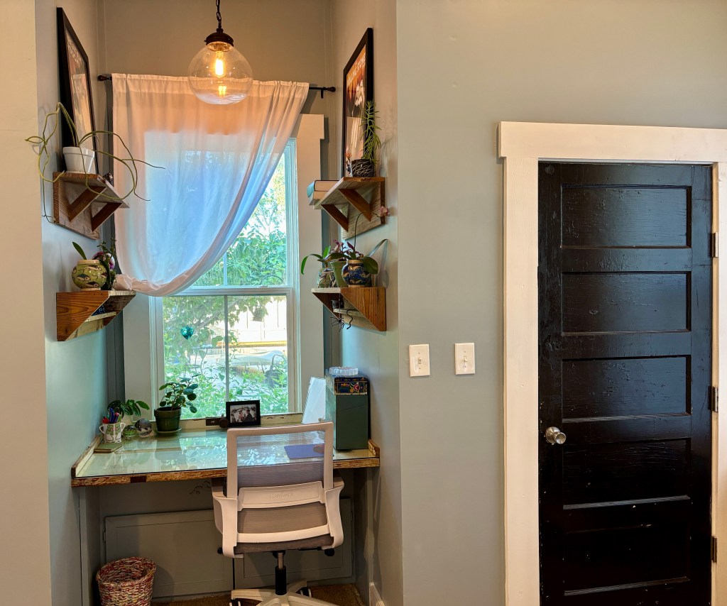 I realize I used to do kind of garden tour style posts and WE SHAN’T BE DOING THAT as no one is interested in that much crab grass right now… but hows about a desk tour? You can KINDA see the alcove for it in that before shot up there.