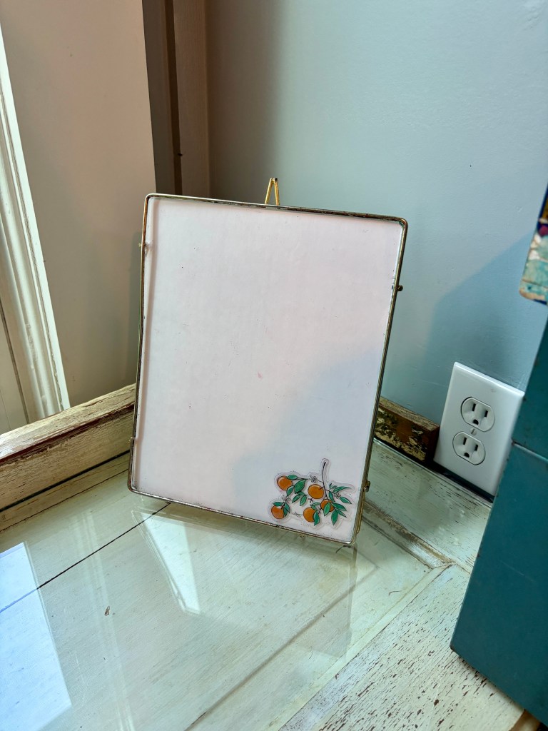 On the desk surface itself I have (barely visible) my antique copy of a Shropshire Lad in case I need a poetry break from construction material sales during the day. I keep my pens, scissors, a cuticle stick, and my good flat head and phillips head screwdrivers in a hand painted, art deco style, condensed milk porcelain jar from Bavaria from around 1910. These can sell for up to $150 online, but mine is missing the lid and underplate. Did you know the inventor of condensed milk invented the product after he was on a sea voyage with a mother and infant and after the mother got sick and her milk dried up, the infant died of malnutrition before they could get to port? Is that a fun fact? I’d like to think that condensed milk had such fancy containers because it was so highly valued for the many children it saved after it’s invention. But also… look at the bottom border of bees on mine! I looooove this thing- and I got it for $10 at an estate sale.