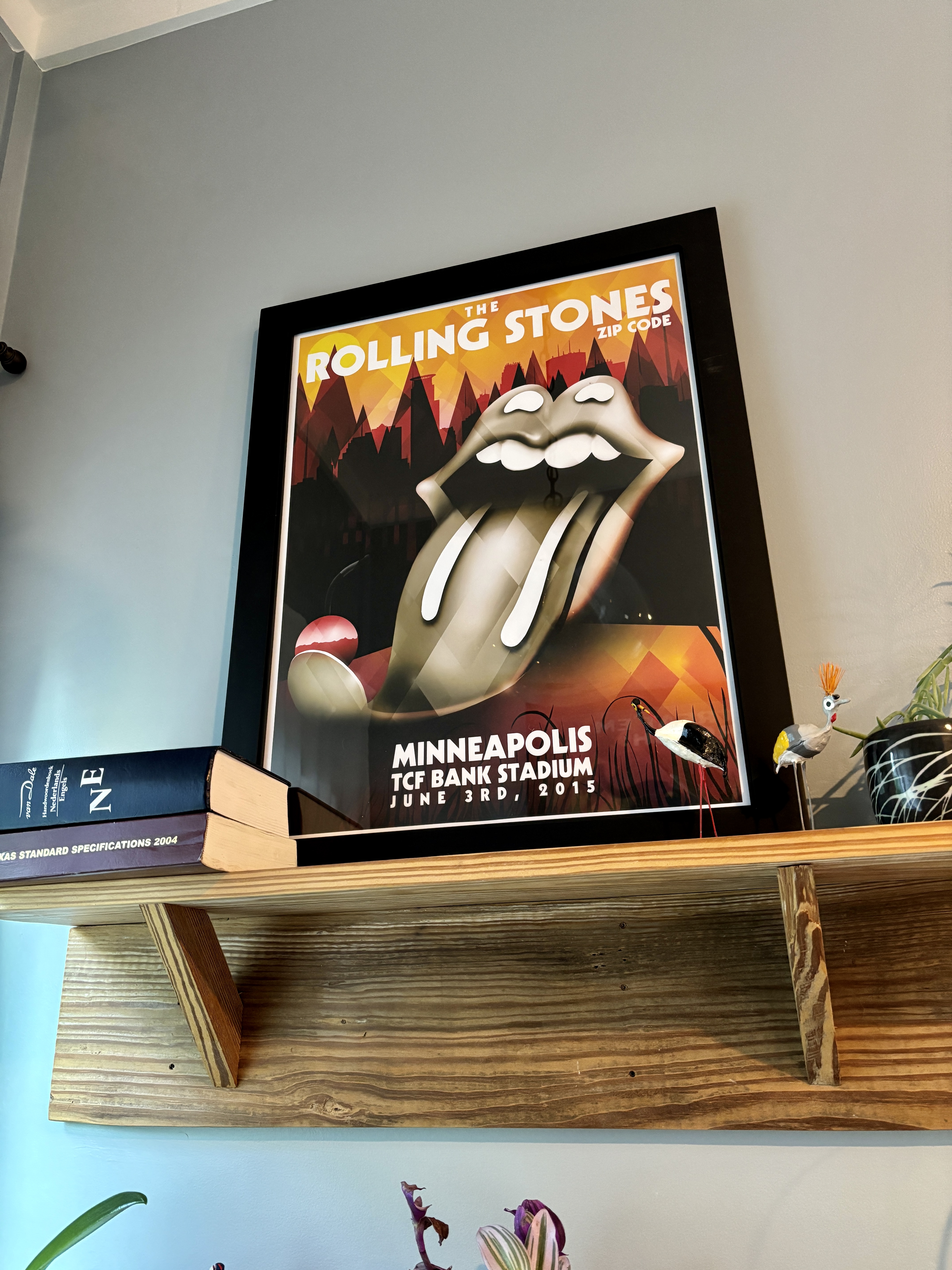 Back up to the pic, next is the poster from the first of the two Rolling Stones shows my husband and I went to- what a great trip. It used to hang over the light switch right next to the door and was what I looked at with fresh eyes recently and went… would I ever be the one to have hung this here? Do I want this here? Hmmm… maybe some changes are in order. I’m okay with it having a less prominent spot.