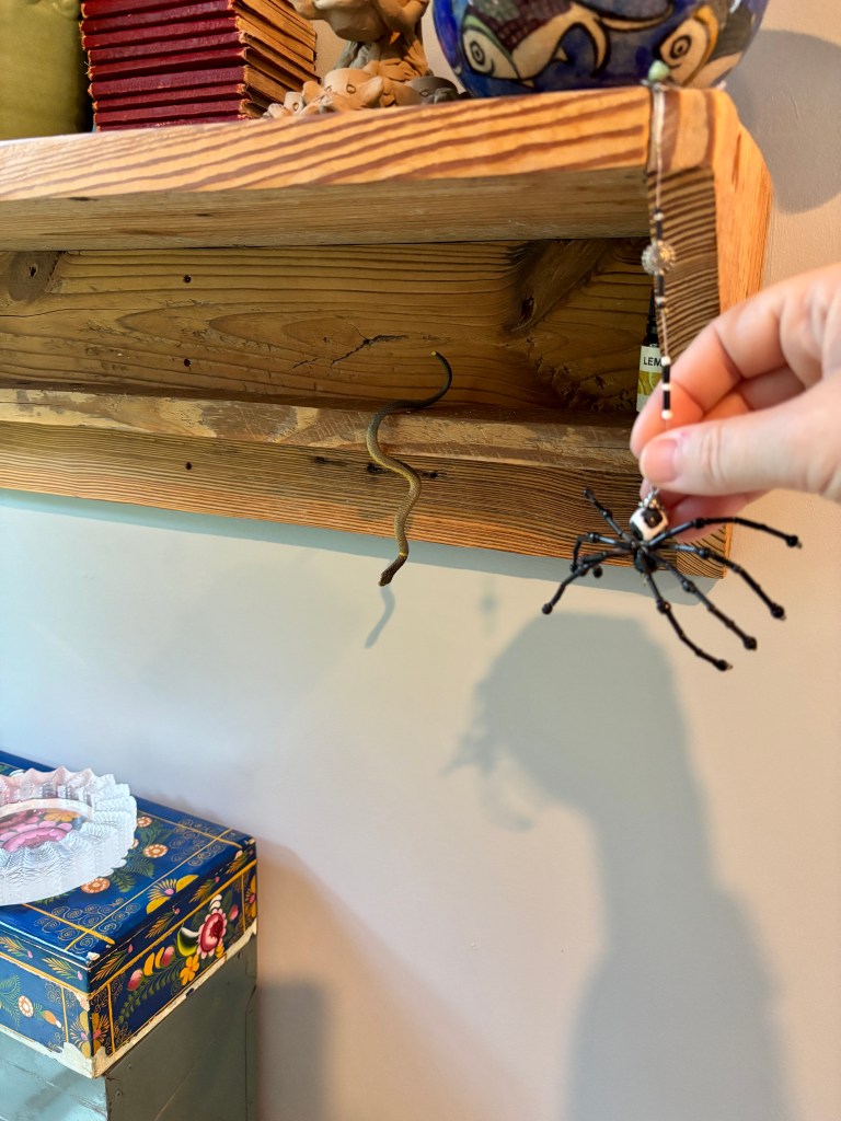 Next up, and hanging off that shelf, is me beaded spider from the neighborhood craft fair. I love these and have two others that are Christmas ornaments, but this one made the cut and is up year round. And that tiny plastic snake is from my first job in this industry again (same as the spec book) and was because we used to hide mini snakes in folders of paperwork to prank each other. It’s over 20 years old too.