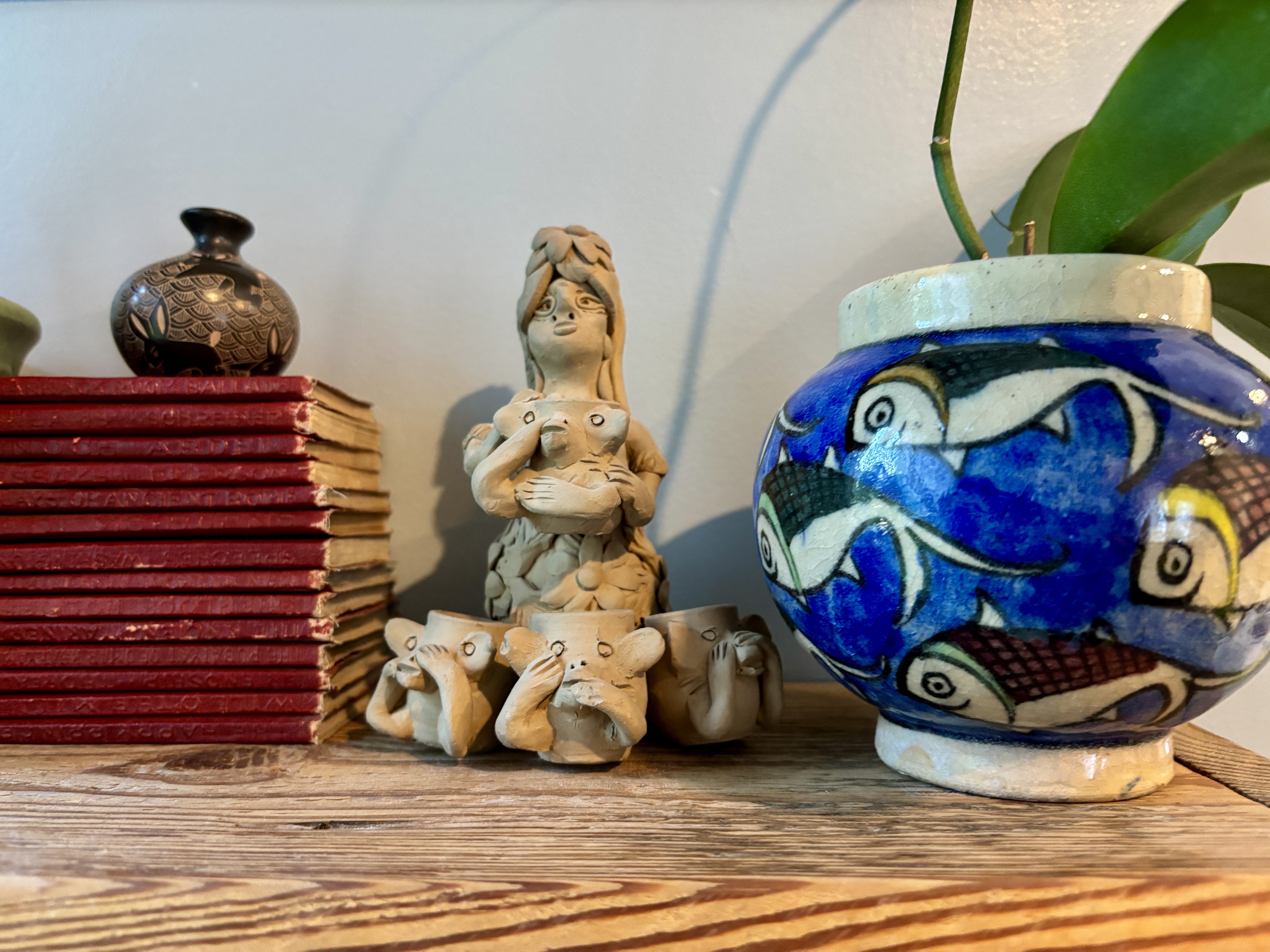 Next up: the stack of leather bound, antique tiny books my Grandpa Dick gave me back in highschool, topped with a tiny vase with bunnies on it my family got me on Mother’s Day from the McNay art museum’s store one year- I wanna say 2022. Then that weird as shit clay figurine of a woman holding anthropomorphic animal head pots is a Teodora Blanco original. I got 3 of those for $75 at an estate sale and then sold two of them (that both had repairs) for $250 each on Ebay. They sold within 18 hours of listing them. I kept the best one for myself, though.