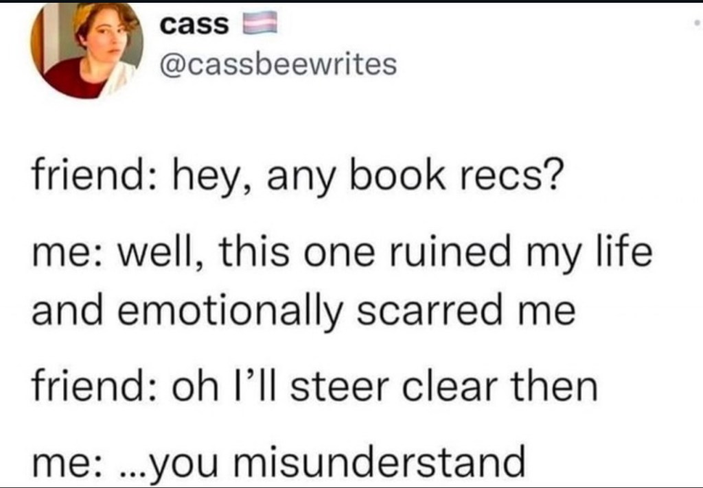 So- you’re fucking welcome, friend- I have to read this shit and she gets to read the nicest life feel book ever.